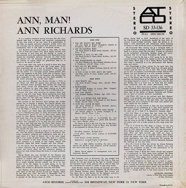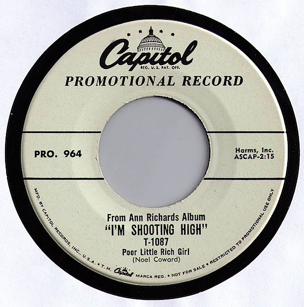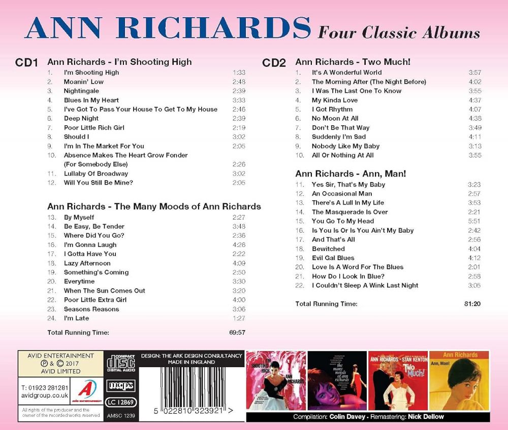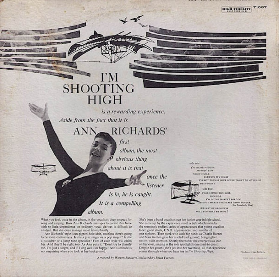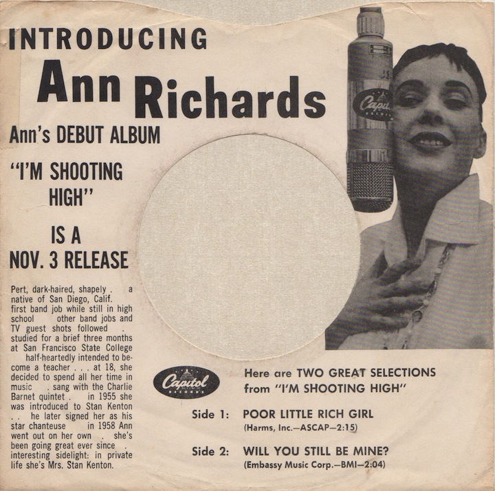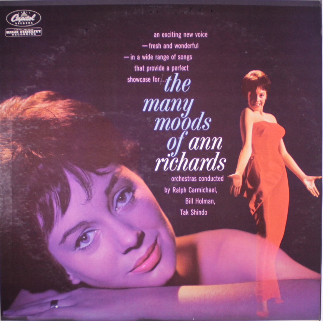 Kenton vermittelte ihr einen Plattenvertrag bei Capitol Records, wo 1958 unter der musikalischen Leitung von Brian Farnon und den Arrangements von Warren Baker ihr Debütalbum I'm Shooting High mit Standards-Material wie Matt Dennis’ Will You Still Be Mine eingespielt wurde. Richards' nächstes Album, The Many Moods of Ann Richards (1959), bot eine stilistische Bandbreite vom Cool Jazz mit Arrangements von Bill Holman bis zu fernöstlichen Exotica von Tak Shindo. 1961 entstand mit Stan Kenton das Album Two Much.