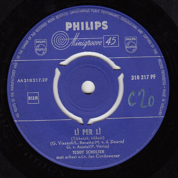 04 59....318 217 PF....TEDDY SCHOLTEN met orkest o.l.v. Jan Corduwener..'N Beetje (Bekroond liedje Nederlandse finale Eurovisie Songfestival 1959)/Lì Per Lì (Tikketak, Tikketi)