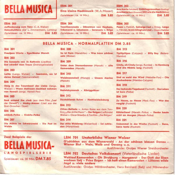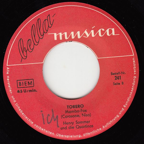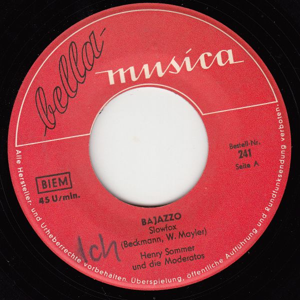 Da eine BELLA MUSICA Normalplatte anfangs DM 2,85 gekostet hat, eine Baccarola-Single hatte den gleichen Preis, nehme ich an, dass BELLA-MUSICA ursprünglich als Billig-Label begonnen hat und daher üblicherweise vorerst Cover-Versionen, dargebracht von völlig unbekannten Interpreten oder Interpreten unter Pseudonym, auf den Markt gebracht hat. Aus dieser Zeit stammt auch Henry Sommer, den ich hiemit vorstellen möchte.