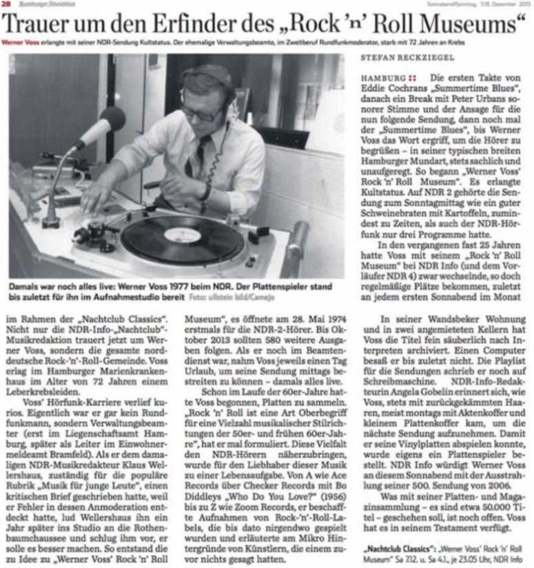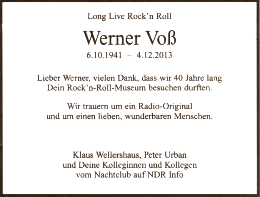 wer kenn nicht das "Werner Voss Rock and Roll Museum" ... ich möchte nach Möglichkeit alle Sendungen in digitaler Form für mich archivieren ... einen Teil habe ich schon ... vielleicht ein drittel - und eher aus der Zeit 70er und frühe bis Mid 80er ...