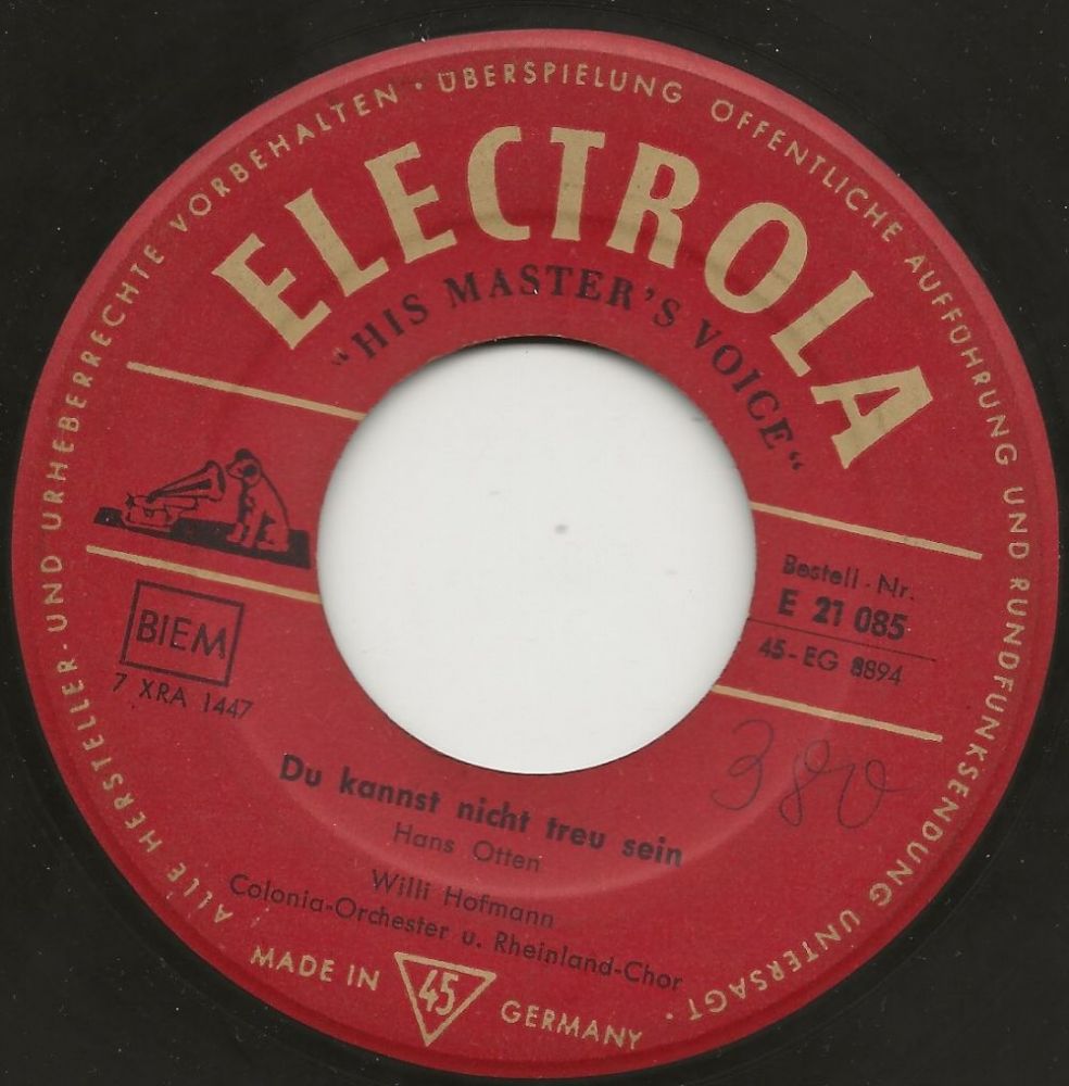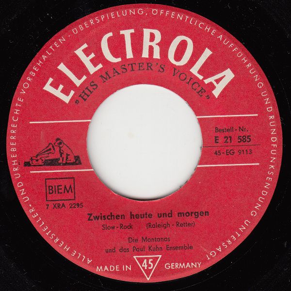 Auf dieser ELECTROLA-Single hört man auf der A-Seite die Straßensänger und auf der B-Seite die Montanas. Für jede Seite einen Thread, das schien mir zu übertrieben. Da auf beiden Seiten das Paul Kuhn Ensemble als Begleitband fungiert schien es mir am vernünftigsten, diese Single hier bei Paul Kuhn unterzubringen. Die B-Seite stammt übrigens von Ben Raleigh, aber bisher ist es mir nicht gelungen, eine Original-Version zu finden.