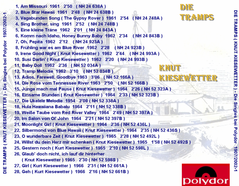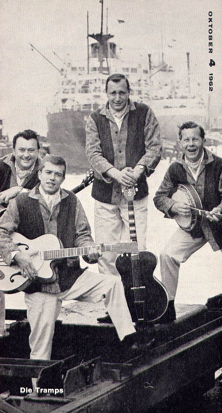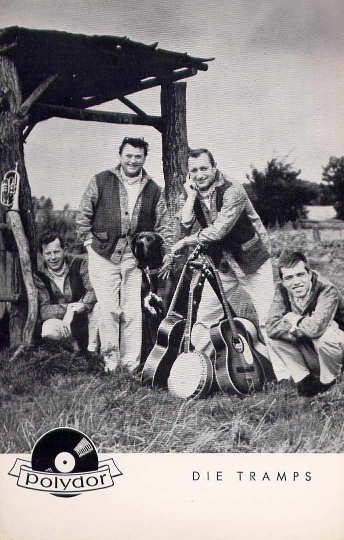 Die Tramps entstanden aus den Mitgliedern des Roland Trios Hans Joachim Kipka, Kurt Stephan und Richard Gatermann (links klicken), indem sie mit dem jungen Knut Kiesewetter auf ein Quartett aufgestockt wurden. In der Literatur und im Netz ist immer die Rede von acht Singles bei POLYDOR von 1961 bis 1964, ich fand jedoch nur sieben. Es gibt eine achte Single der Tramps, allerdings bereits anfangs 1959 und auf METRONOME. Könnte das die fehlende Single sein? Ich hoffe, Heino kann da helfend eingreifen.