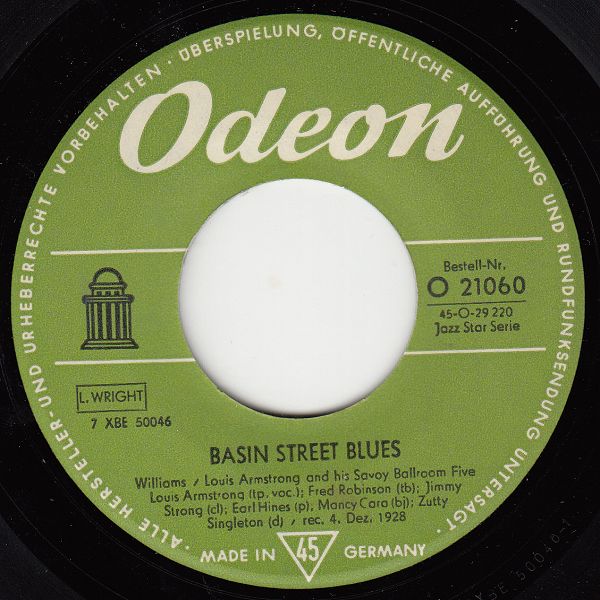 02 59....O 21 060....Louis Armstrong and his Orchestra / Louis Armstrong (tp, voc); Henry Allen, Otis Johnson (tp); Jay C. Higginbotham (tb); Teddy Hill (ts); Albert Nicholas (cl, as); Charlie Homes (as); Luis Russell (p, ld); Will Johnson (g); Pops Foster (b); Paul Barbarin (d) / rec. 13. Dez. 1929..ST. LOUIS BLUES/Louis Armstrong and his Savoy Ballroom Five Louis Armstrong (tp, voc); Fred Robinson (tb); Jimmy Strong (cl); Earl Hines (p); Mancy Cara (bj); Zutty Singleton (d) / rec. 4. Dez. 1928..BASIN STREET BLUES
