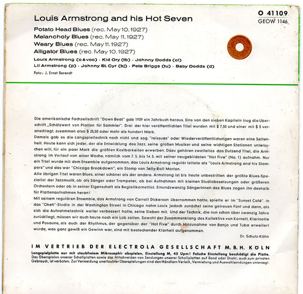 09 60....O 21 537....Louis Armstrong and his hot Seven..Potato Head Blues/Louis Armstrong and his Savoy Ballroom Five..St. James Infirmary Blues