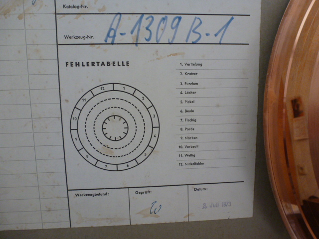 Auf der Platte selbst gibt es folgende Eingravierungen: 19,10,83 16/8 b Ri 20, auf dem Karton ist folgende Nummer vermerkt: A 1309 B-1 und das Datum 3. Juli 1973.