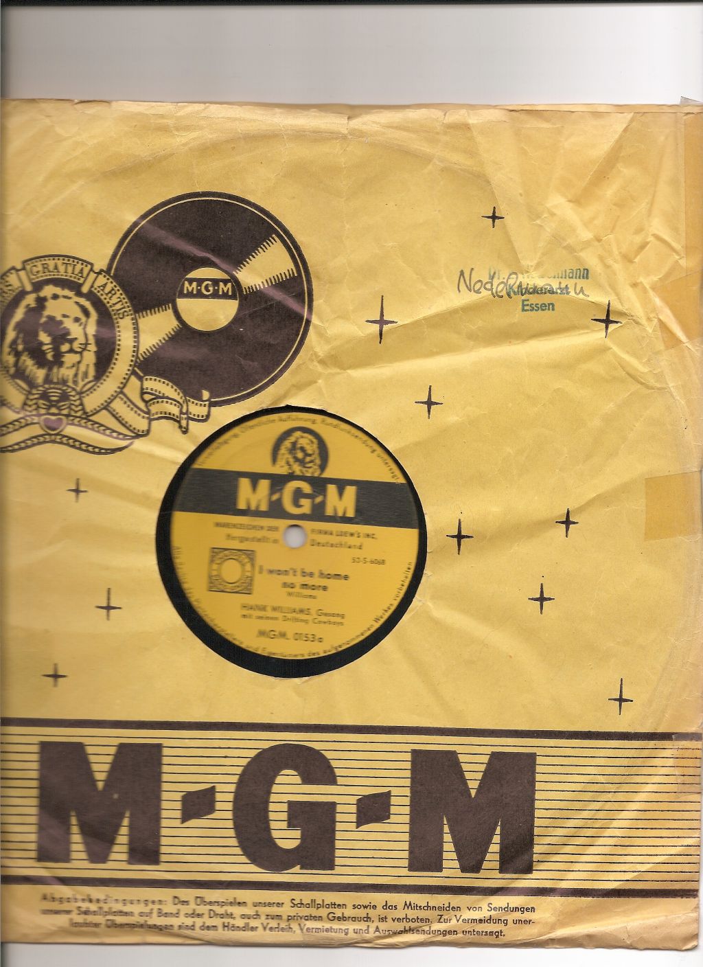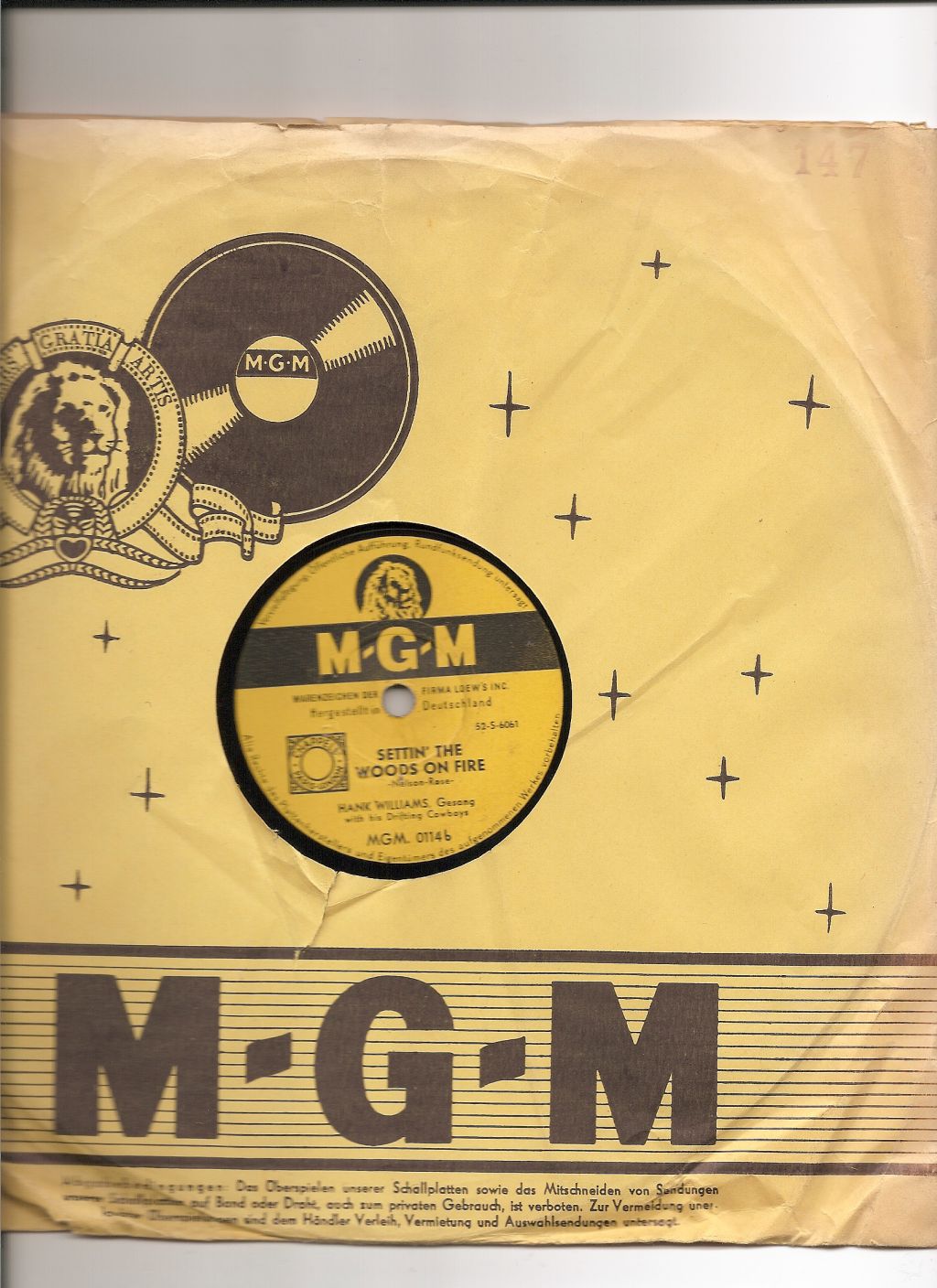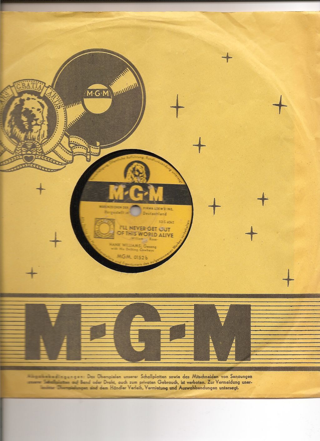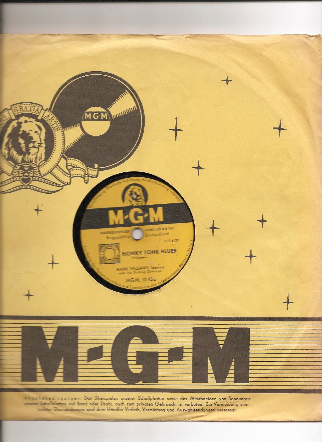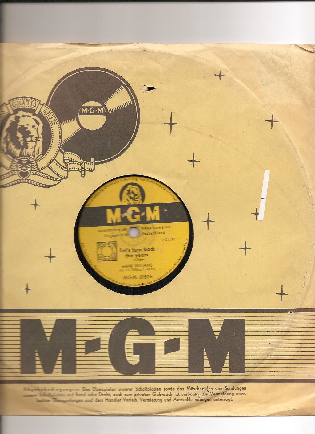 Als die Electrola 1954 die ersten Schellack-Platten von Hank Williams presste, gab es in Deutschland kaum jemanden, der mit diesem Sänger etwas anfangen konnte. Und nur wenige Liebhaber konnten seine Musik überhaupt einordnen: Der Klassiker „Jambalaya“ / „Settin’ The Woods On Fire“ (MGM 0114) stand damals bereits in den Regalen der Plattenläden. Aber für Country Musik gab es in jenen frühen Tagen ebenso wenig eine Chance wie für die ersten Rock’n’Roll-Aufnahmen von Smiley Lewis und Bill Haley. Vier Jahre später konnte MGM jedoch ein paar Treffer landen – mit Connie Francis („Who’s Sorry Now“ / „You Were Only Fooling“, 20 684), Conway Twitty („It’s Only Make Believe“ / „I’ll Try“, 20 979), Tommy Edwards (“It’s All In The Game” / “Please Love Me Forever”, 21 010) und den Impalas (“Sorry, I Ran All The Way Home” / “Fool, Fool, Fool”, 21 158). 1960 übernahm die deutsche Grammophon das Label MGM von Electrola. Einen nenneswerten Hit verzeichnete noch einmal Sam The Sham mit seinen Pharaos („Wooly Bully“ / „Ain’t Gonna Move", 61 113) 1965. Das MGM Label gehört noch heute der PolyGram.