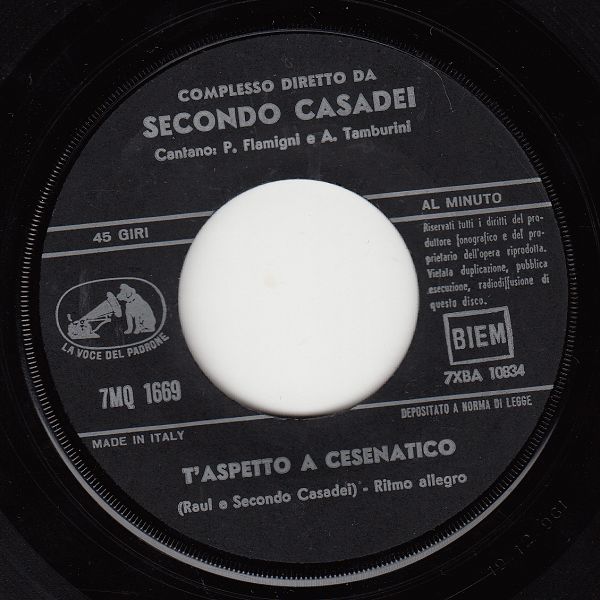 12 61....7MQ 1669....Complesso diretto da SECONDO CASADEI - Cantano: P. Flamigni e A. Tamburini..T'aspetto a Cesenatico (7XBA 10834)/SECONDO CASADEI E IL SUO COMPLESSO Canta: P. Flamigni con coro..Festa in paese (7XBA 10725)