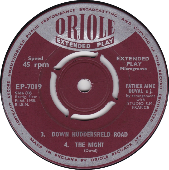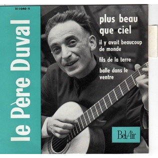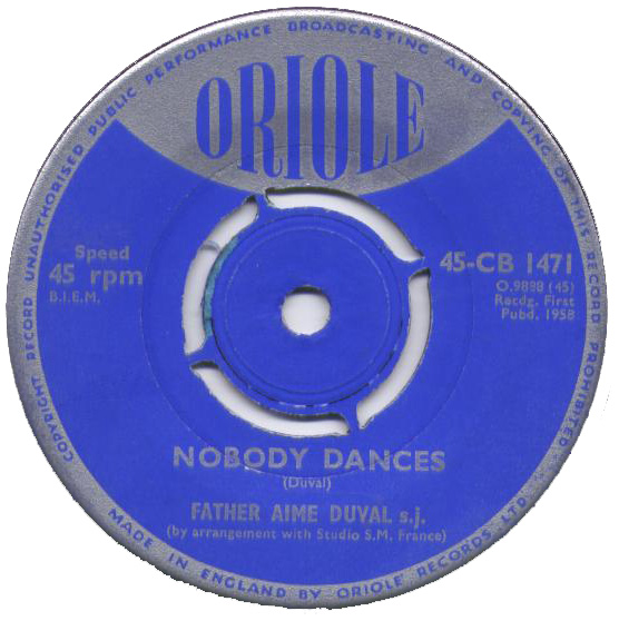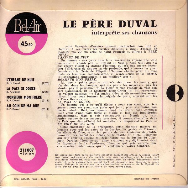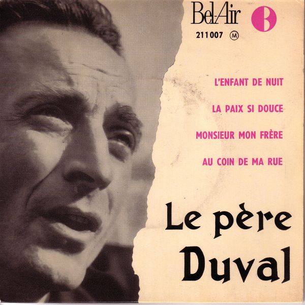 Der Chanson-Schreiber, Priester und Ordensangehörige P. Aimée Duval SJ, auch Le Pére Duval, wurde am 30. Juni 1918 in Le Val-d'Ajol, Lothringen, Frankreich, als Lucien Duval geboren und verstarb am 30. April 1984 in Metz, Lothringen, Frankreich. Da er seine religiösen Chansons selbst mit seiner Gitarre interpretierte, erhielt er den Beinamen "Gitarrist Gottes". Die üblichen "Juke Box Singles" habe ich bei Duval nicht gefunden. Vermutlich gab es seine Chansons nicht in Musikboxen und für den Export dürften auch keine Singles hergestellt worden sein. Die folgende Disco enthält daher nur EPs.