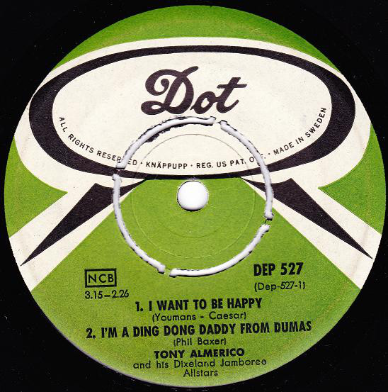 ?? 53....45-15082....Tony Almerico and his Dixieland Jamboree Allstars Trumpet, Tony Almerico; Clarinet, Tony Costa Tromb., Jack Delaney; Sring Bass, Joe Loyacano Drums, Johnny Castaing; Tenor Sax, "Shorty" Reese..Basin Street Blues (E3KW 2409 M 8044)/I Want To Be Happy (E3KW 2410 M 8045)……….links Mitte: Vocal by ??????/Instrumental