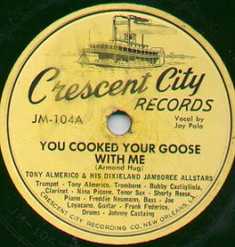 ?? 53....45-15081....Tony Almerico and his Dixieland Jamboree Allstars Trumpet, Tony Almerico; Trombone, "Buddy" Castigliola Clarinet, Nina Picone; Tenor Sax, "Shorty" Reese Piano, Freddie Neumann; Bass, Joe Loyacano Guitar, Frank Federico Drums, Johnny Castaing..You Cooked Your Goose With Me (E3KW 2407 M 8042)/Ding Dong Daddy (E3KW 2408 M 8043)……….links Mitte: Vocal by JOY PALO/Vocal by TONY ALMERICO