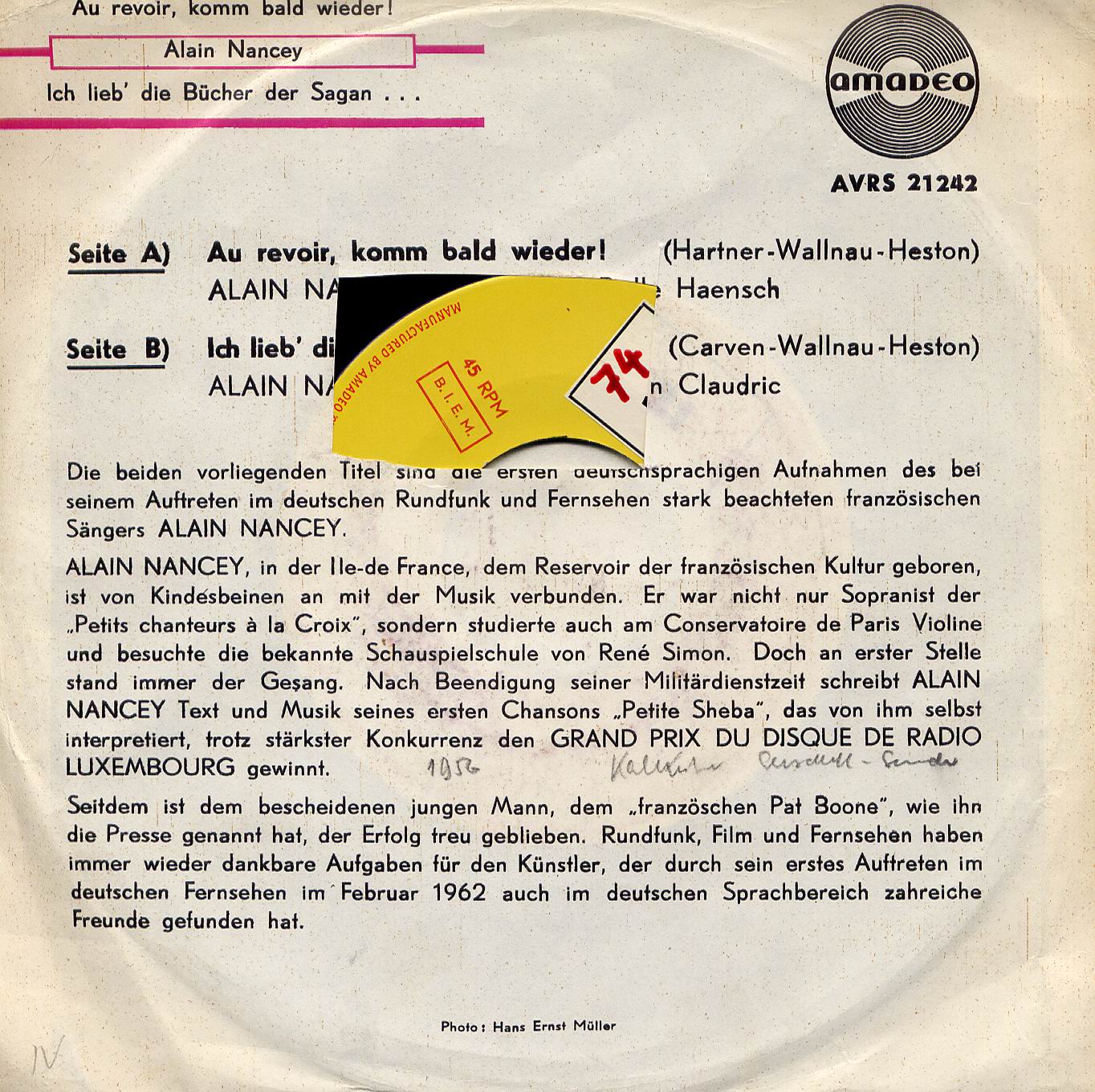 10 62....AVRS 21242 A....ALAIN NANCEY Orchester Delle Haensch..Au revoir, komm bald wieder/ B....ALAIN NANCEY Orchester Jean Claudric..Ich lieb' die Bücher der Sagan . . .