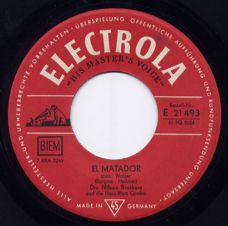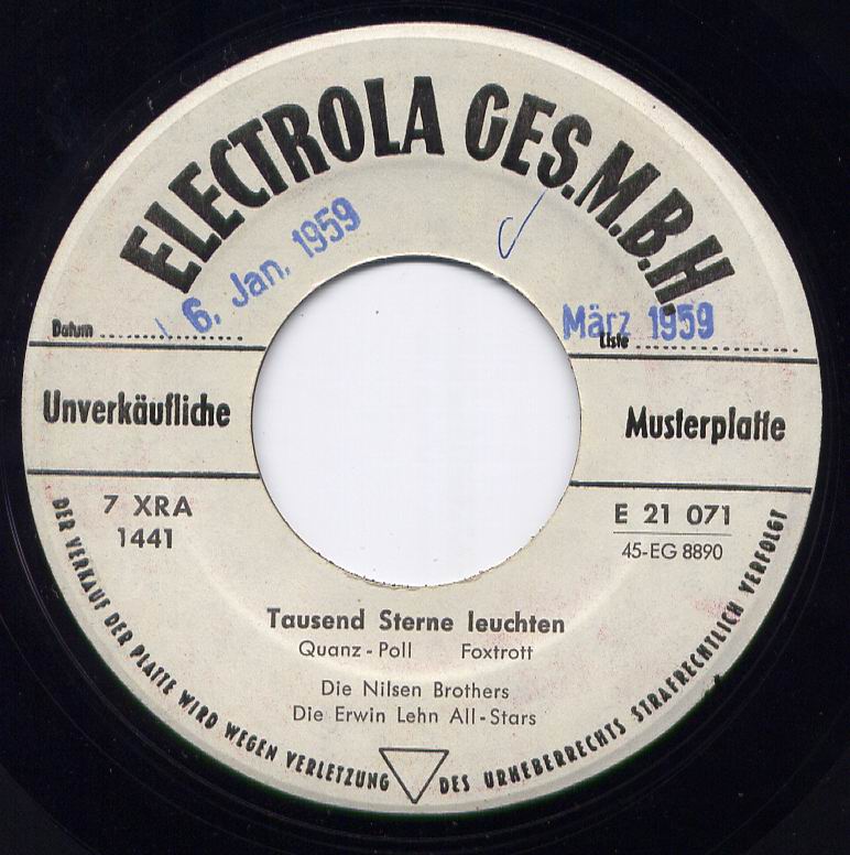 HI-FI’s, Die (Die NILSEN BROTHERS), Gesang, Electrola 21121 ("Tausend Sterne Leuchten"/"Wer Weiß Wohin Der Wind Uns Weht"-1959 & Die ERWIN LEHN ALL-STARS), liegt als unverkäufliche Musterplatte E 21071 vor ("Tausend Sterne Leuchten"/"Wer Weiß Wohin Der Wind Uns Weht"-1959 Die NILSEN BROTHERS & Die ERWIN LEHN ALL-STARS)