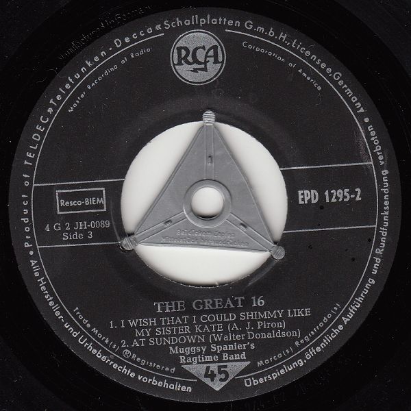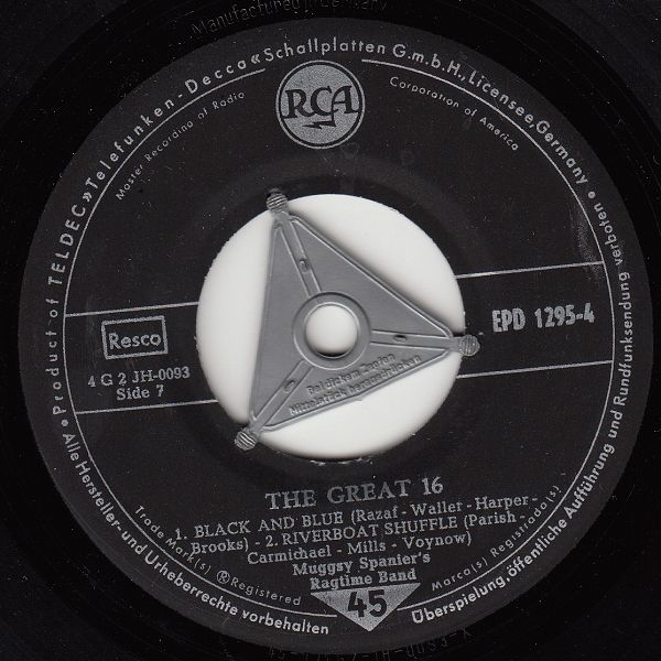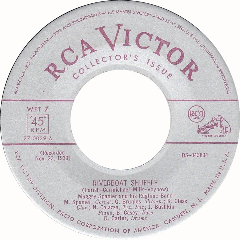 .............27-0039-A….Muggsy Spanier and his Ragtime Band M. Spanier, Cornet; G. Brunies, Tromb.; R. Cless, Clar.; N. Caiazza, Ten. Sax; J. Bushkin, Piano; B. Casey, Bass; D. Carter, Drums..Riverboat Shuffle (BS-043894)/-B….At Sundown (BS-043896)