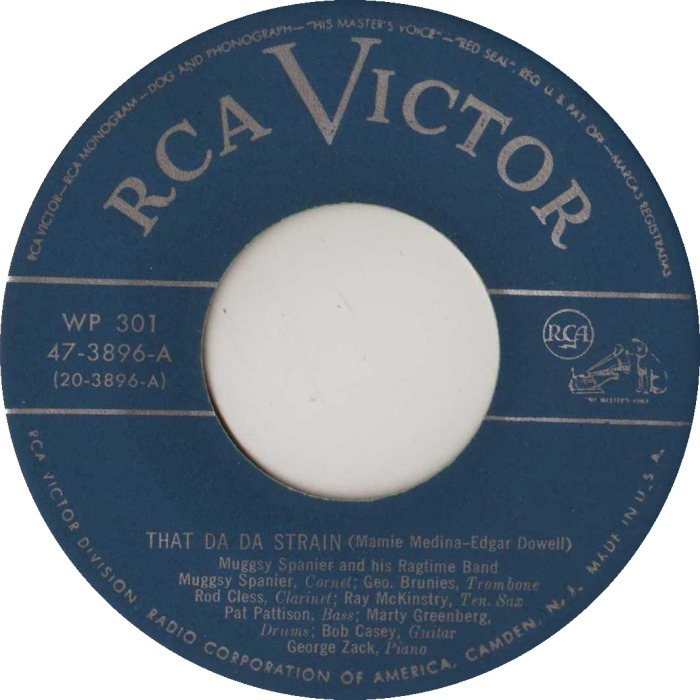 .............47-3896-A….Muggsy Spanier and his Ragtime Band Muggsy Spanier, Cornet; Geo. Brunies, Trombone; Rod Cless, Clarinet; Ray McKinstry, Ten. Sax; Pat Pattison, Bass; Marty Greenberg, Drums; Bob Casey, Guitar; George Zack, Piano..That Da Da Strain (20-3896-A)/-B….Muggsy Spanier and his Ragtime Band Muggsy Spanier, Cornet; Geo. Brunies, Trombone; Rod Cless, Clarinet; Bernie Billings, Ten. Sax; Bob Casey, Bass; Joe Bushkin, Piano; Don Carter, Drums..Dipper Mouth Blues (20-3896-B)