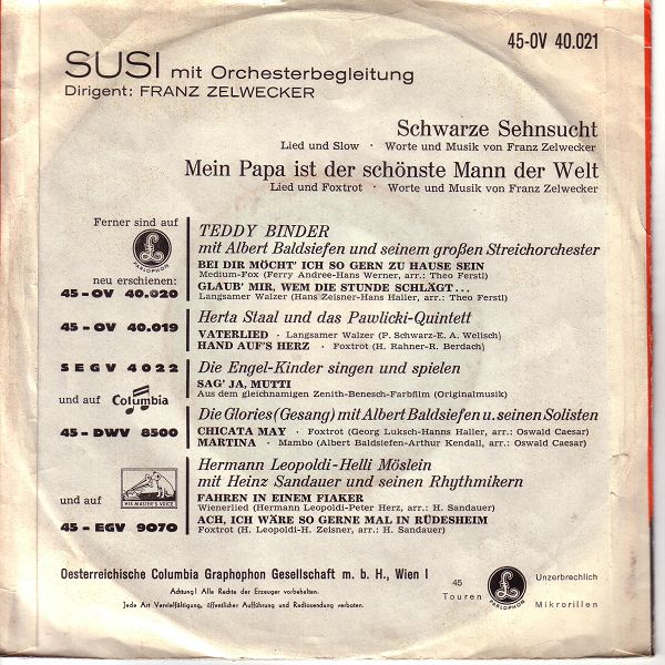01 59....45-OV 40.021....SUSIE mit Orchester Dir.: FRANZ ZELWECKER..Schwarze Sehnsucht/Mein Papa ist der schönste Mann der Welt