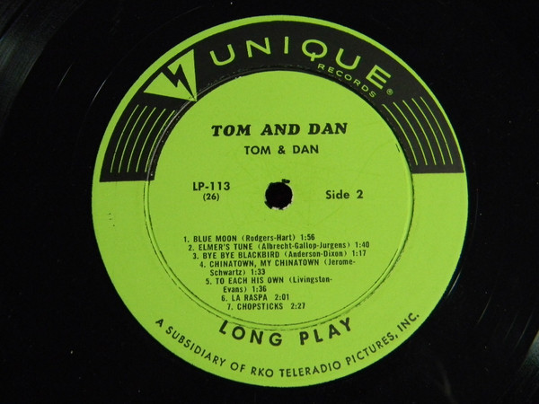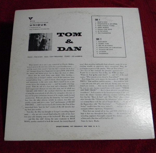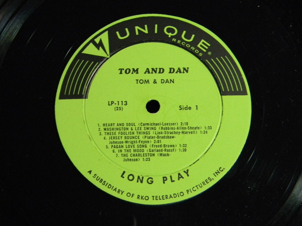 Das Piano-Duo Tom & Dan, wer immer das auch (gewesen ?) sein mag, spielte 1956 mit Unterstützung von Tony Fernandez am Bass und Joe Meadows am Schlagzeug, bei UNIQUE (ULP-113) 14 Titel im waschechten Ragtime-Jazz ein. Aus sechs Titel dieser LP entstanden danach drei Singles.