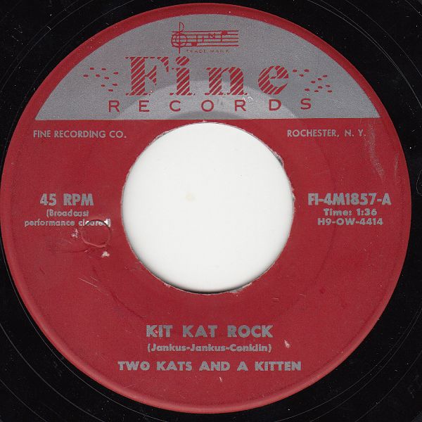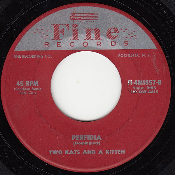 Here's a good one. Obviously a "lounge" act who is trying to cash in on the Rock & Roll craze, it sounds like an accordion player and a drummer with a girl singing along. This one is so hokey that I fall off my chair laughing every time I hear it. Lot's of energy though! I love the "kat" sound effects too. I included the flip "Perfidia" because it's so damn cheesy.