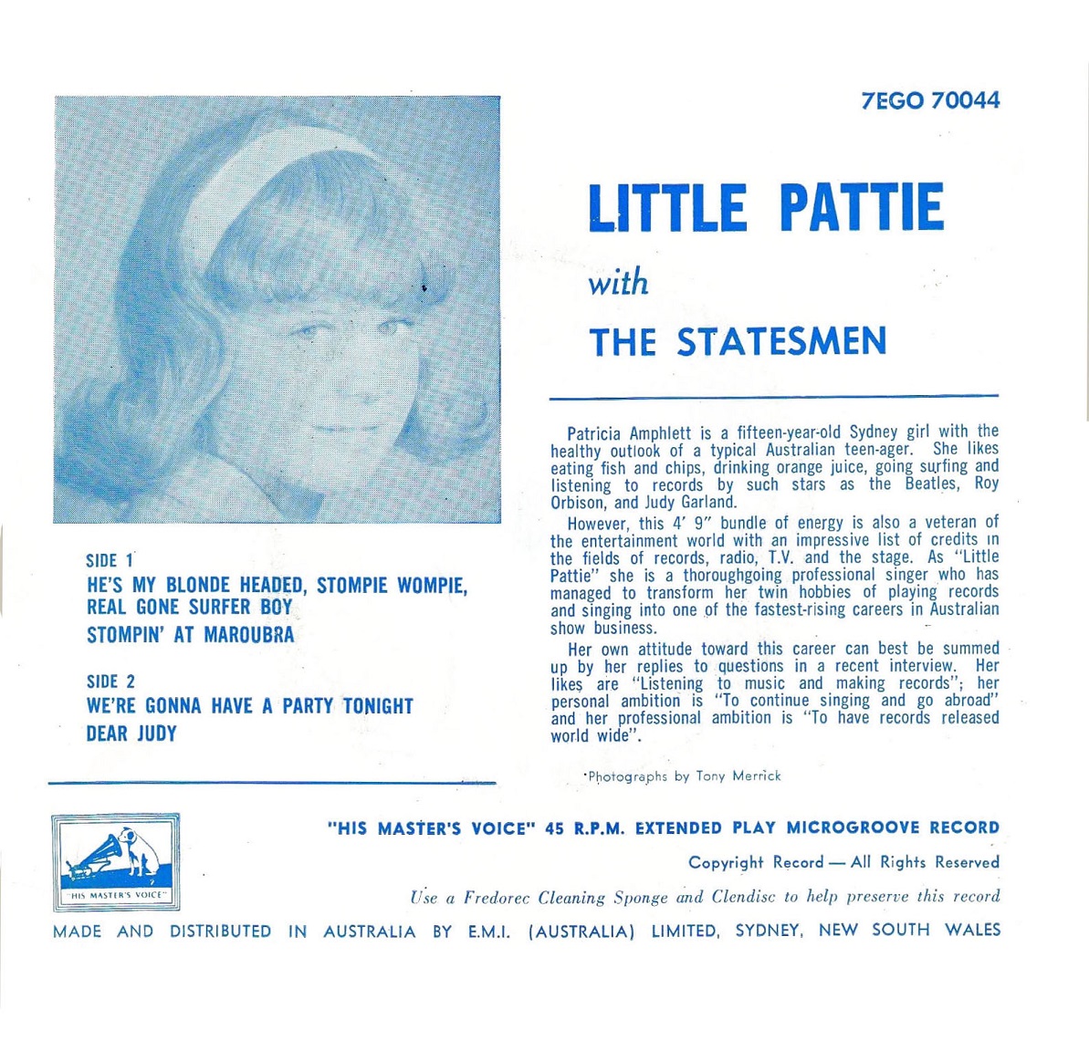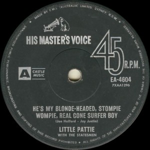 She picked up a weekly gig at Bronte Surf Club, backed by a band called the Statesmen. During one of these performances Amphlett was spotted by an EMI Records talent scout, was given an audition and then a contract. Her first single for the label, He's my blonde headed stompie wompie real gone surfer boy was released on 7 November 1963. By the following January it had risen to number two in the Top 40 charts, only kept from the number one position by the Beatles' I wanna hold your hand.