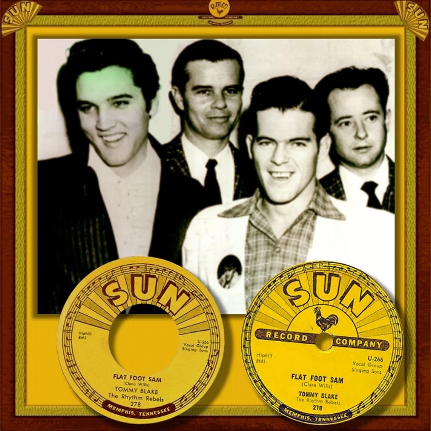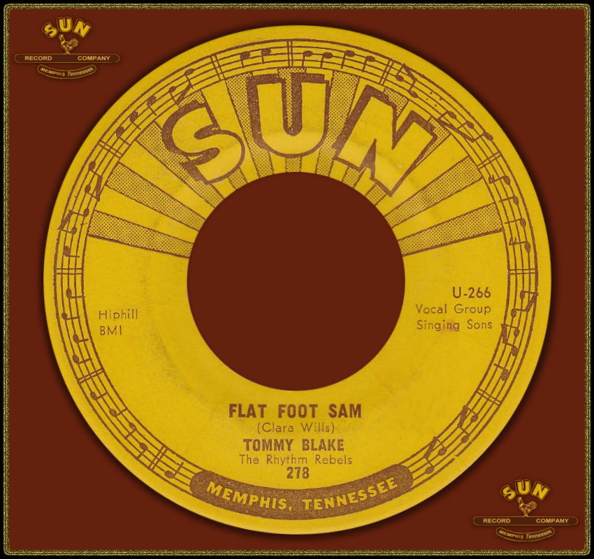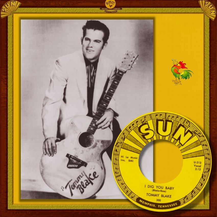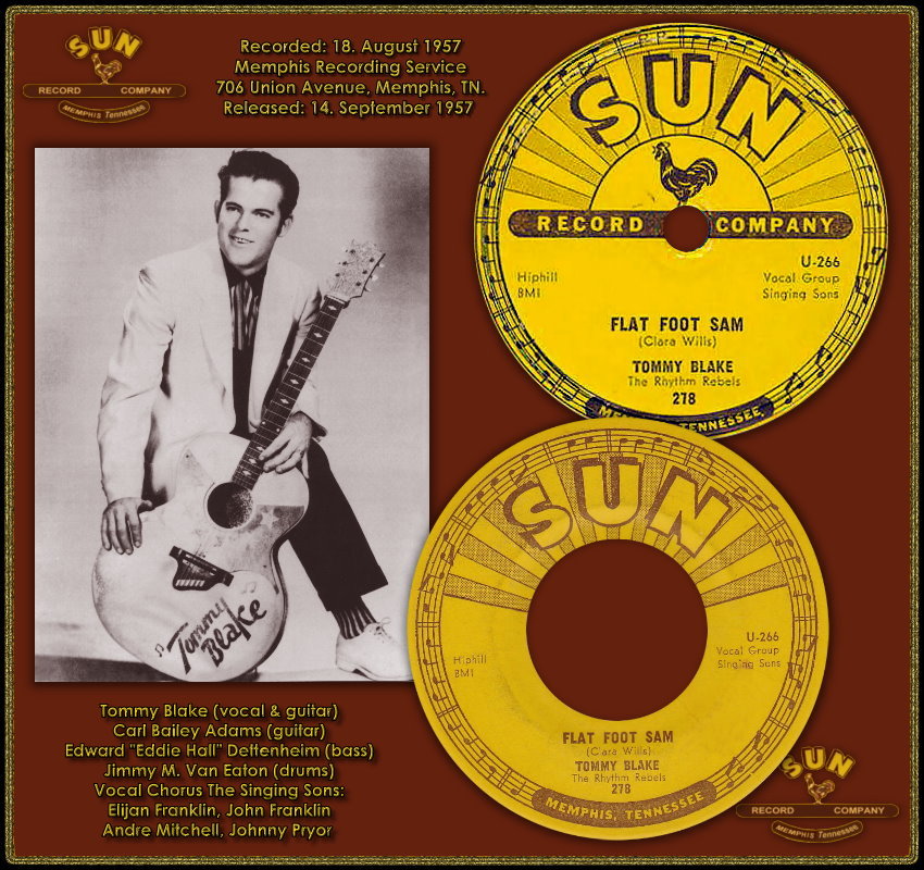 Nach Problemen mit dem Label wechselte Blake nun im August 1957 zu Sun Records, der Geburtsstätte des Rockabilly. Sein Song “Flat Foot Sam“ (Sun 278), eine Cover-Version des Rhythm’n’Blues-Titels von T.V. Slim auf Checker 870, verkaufte sich seit September 1957 gut genug, um bei Sun Records im März 1958 eine weitere Single (Sun 300) aufzunehmen und mit den angestammten Sun-Studiomusikern zu spielen (Roland Janes-g, Sid Manker-g, Stan Kesler-b, Jimmy Wilson-p, J.M. Van Eaton-d). Am 16. März 1958 gehörte sogar Edwin Bruce einmal als Gitarrist zu den Studio-Musikern einer Session für Aufnahmen von Tommy Blake. Eingespielt wurde u.a. der Titel “I Dig You Baby“ für die Single-Veröffentlichung Sun 300.