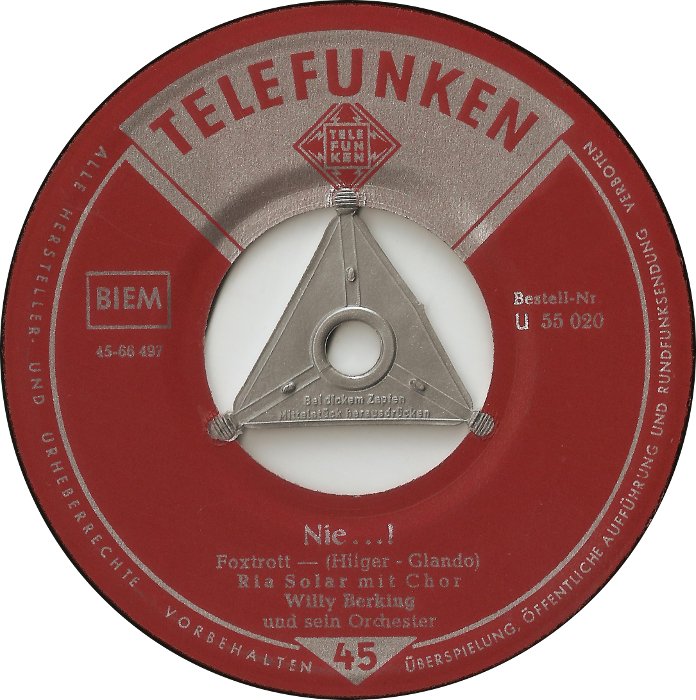 Die Frage ist, wie kamen Hilger und Glando, also Willy Berking und Heinz Woezel, bei Ria Solar's "Nie . . . !" in die Klammer? Erschwerend ist noch der Umstand, dass die Originalversion ebenfalls von TELDEC, also von der gleichen Firma wie die Deutsch-Version, vertrieben wurde. War das ein Irrtum oder volle Absicht? Diese Fragen lassen sich heute kaum mehr beantworten.