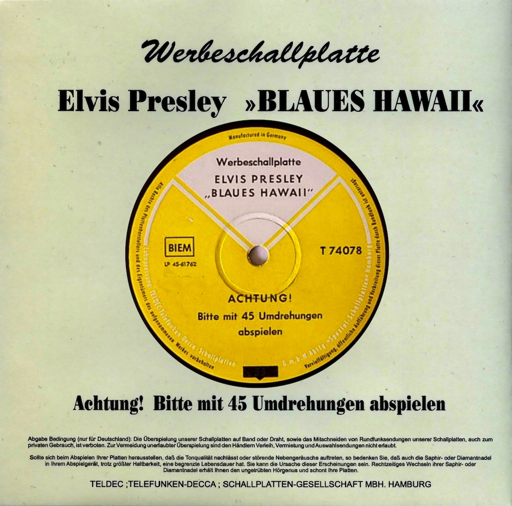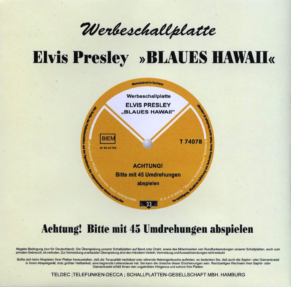 Bei dieser Schallplatte dürfte es sich sicherlich um die teuerste deutsche Elvis-Presley-Scheibe handeln. Sie erschien im 25cm-Format und musste mit 45 Umdrehungen abgespielt werden. Die Titelzusammenstellung entsprach exakt der auf der EP „Blue Hawaii“ (EPA 2426)