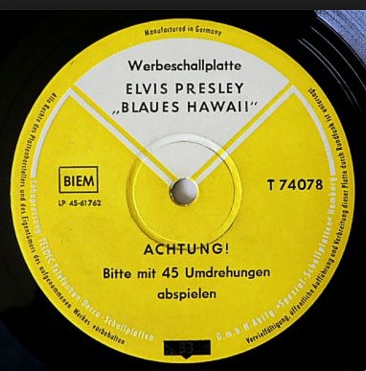 Auf der Recherche zu dieser Schallplatte sind wir auf einen Filmvorführer gestoßen, der sammelt nun die durch die Digitalisierung ausrangierten Verleihfilme (Kino). Er hat den Film Blue Hawaii. Er hätte damals in der Filmbox eine kleine LP gefunden, da würde BIEM als Bezeichnung stehen. Er kam sofort vorbei, Label und Hülle kopiert, von seinem Schatz wusste er nichts.