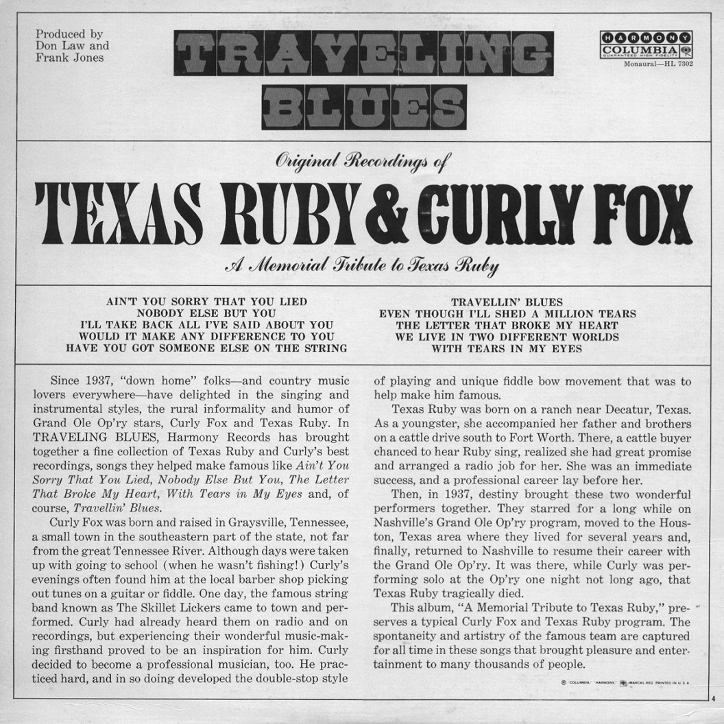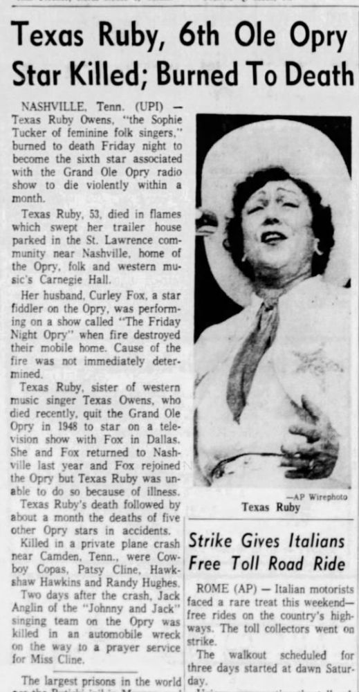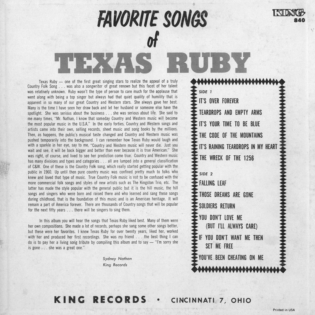 Texas Ruby (* 4. Juni 1908[1] nahe Decatur im Wise County, Texas, als Ruby Agnes Owens; † 29. März 1963) war eine US-amerikanische Country-Musikerin. Zusammen mit ihrem Mann Curly Fox war Texas Ruby im Bereich des Country eine der erfolgreichsten Radiopersönlichkeiten zwischen 1941 und 1948.