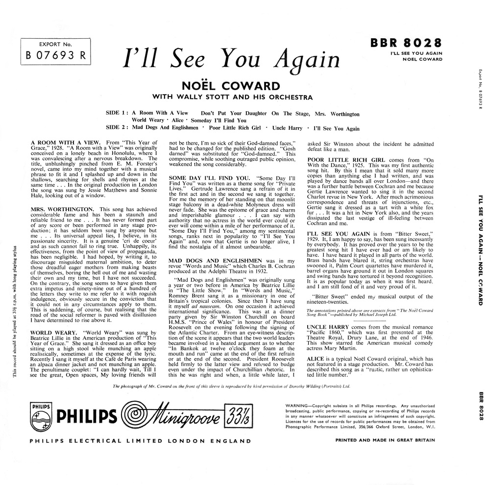 For the duration of the 1920s, his career continued to see-saw between bouquets and brickbats, but in 1929 Coward mounted his most mature production yet with Bitter Sweet, a quasi-Viennese operetta which launched the song "I'll See You Again." 1930's Private Lives, a romantic comedy written in honour of Lawrence, further established his newfound mastery, and with the 1931 historical epic Cavalcade and its song "Twentieth Century Blues" his position as a talent of international renown was assured.