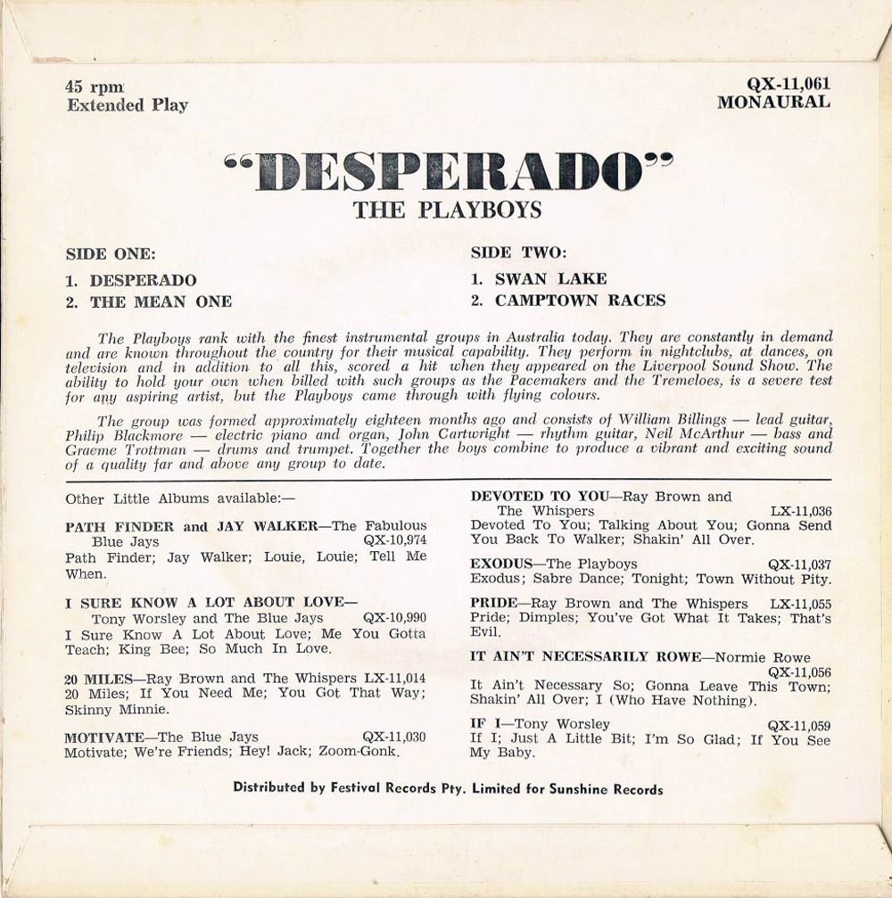 Die Playboys gehörten zu einer kleinen Gruppe australischer Bands, die Mitte der 60er Jahre internationale Bekanntheit erlangten. Sie nahmen ein Album und eine Reihe von Singles auf - unter anderem in England -, aber ihr breitestmöglicher musikalischer Beitrag war vielleicht das Personal, das Ende der 1960er Jahre zur pop-psychedelischen Band Procession wurde. Die Playboys wurden ursprünglich im Jahr 1962 in Melbourne, Australien als Instrumental-Outfit organisiert, mit einer Mitgliedschaft, Graham Trottman am Schlagzeug und Phil Blackmore an der Orgel enthalten. Sie machten sich bald einen Namen in der Stadt und weit darüber hinaus und waren gut genug, um Gerry & the Pacemakers und Brian Poole & the Tremeloes auf einer Tour durch Australien im Jahr 1964 zu unterstützen. Sie wurden später im selben Jahr zum Sunshine-Label verpflichtet, und nahm eine ganze LP auf, zusätzlich zu fünf Singles zwischen Januar 1965 und Mai 1966. Ihre andere wichtige Funktion war als "Hausband" für Sänger wie Marcie Jones und Billy Adams, die auch an Sunshine unterzeichnet wurden. Aber ihre große Pause kam, als sie als die permanente Rückendeckung für Normie Rowe, eine Johnny Kidd-Stil Seele Belter, der eine der heißesten Sänger in Australien in der Mitte der 1960er Jahre war ausgewählt wurde. Und es war Rowe, der sie im späten Herbst 1966 auf einer britischen Tour nach England brachte.
