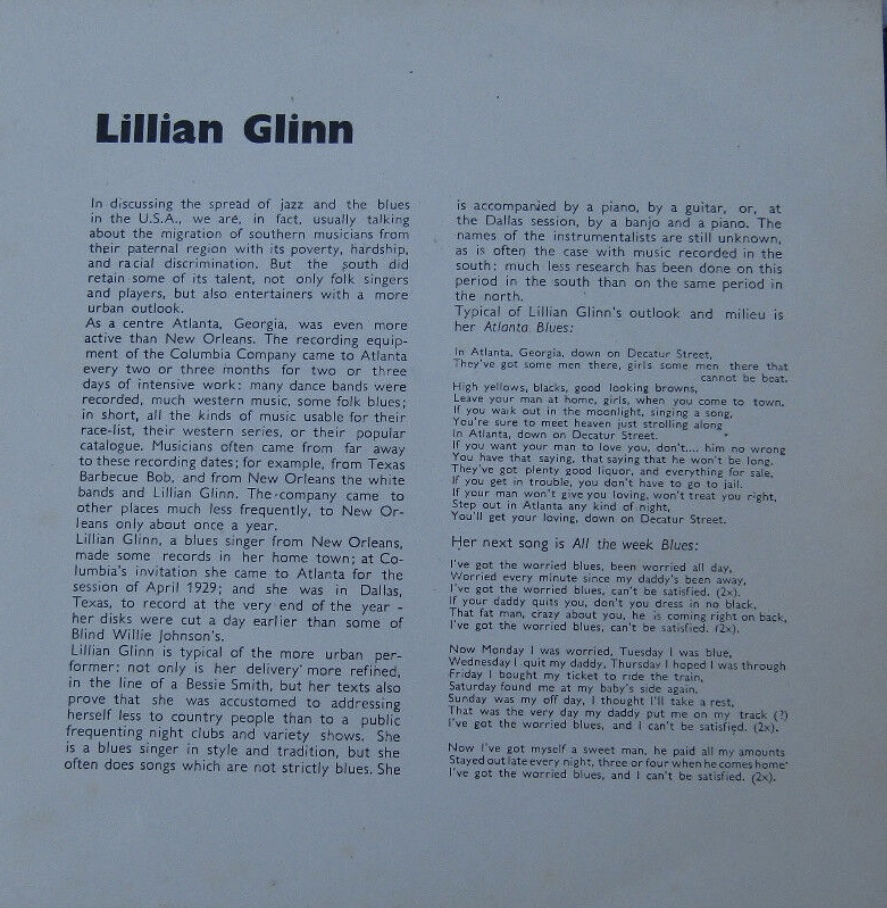Der Musikwissenschaftler David Evans bemerkte, dass „es sehr wahrscheinlich ist, dass viele von Lillian Glinns Blues ohne einen aufgeführten Komponisten ihr eigenes Material waren. Wenn dem so wäre, wäre sie die Ausnahme unter Columbias Blues-Sängerinnen.“