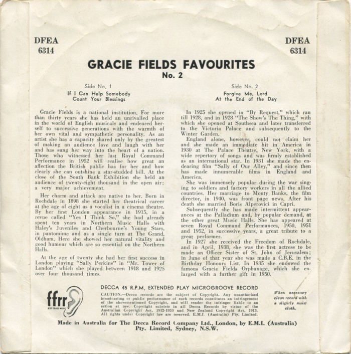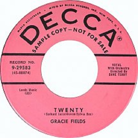 Als Gracie Fields nach Amerika ging gehörten US-DECCA und britische DECCA noch zusammen, da die Trennung und der Verkauf der US-DECCA erst 1941 erfolgte. Nachdem sie in ihre Heimat zurückkehrte, begann sie bei der britischen DECCA, die aber bereits von der US-DECCA getrennt war, ihre Einspielungen. In den USA konnte sie niemals die Popularität erlangen, die sie in ihrer Heimat früher hatte und da könnte man die Idee gehabt haben, vielleich auch aufgrund der ehemaligen "Verwandtschaft", dass man die Restbestände dieser DECCA-Single, die auf dem US-Markt nicht so richtig anzubringen waren, der britischen DECCA verkaufte, die sie dann auf den britischen Markt anbot. Das könnte auch der Grund dafür sein, dass man nirgendst diese britische DECCA findet und es keine britische Matrix gab, wie es damals üblich war (siehe oben Ronnie Height). Ich kann mir gut vorstellen das die Absicht bestand, auch eine britische Pressung herzustellen und daher vorerst nur eine Bestellnummer vergeben wurde. Offenbar haben aber die US-Pressungen gereicht und es kam nicht mehr dazu.