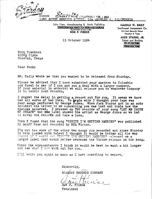 Entschuldigungsbrief von Don Pierce (Starday) im Oktober 1954 wurde