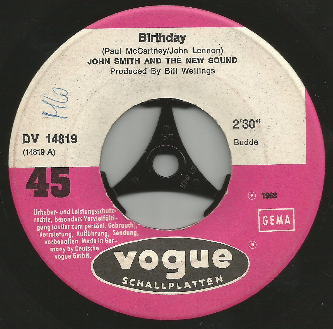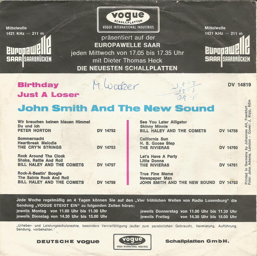 Hier eine Liste der in Deutschland auf Vogue erschienenen Singles von John Smith & The New Sound. Die erste (DV 14573) wurde mit zwei verschiedenen B-Seiten geliefert, wobei ich nicht ganz sicher bin, welches die erste Version war (vermutlich die mit "Wait For Me Baby"). Ob der Erscheinungstermin November 1966 für beide Varianten zutrifft, kann wohl auch nicht mit Sicherheit gesagt werden.