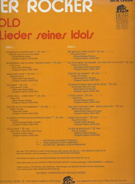 Bei Peter Kraus ist die Anzahl der originalen alten LPs schon überschaubar angefangen mit seiner 10-Inch LP, von Gus Backus und Bill Ramsey gibt es da in LP-Hinsicht auch nicht so viele Alben, dafür aber mehrere EPs und Singles, von Ted Herold stach mir folgender Fakt mal direkt ins Auge.