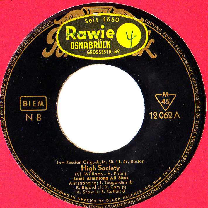 Louis Armstrong mit dem Sticker von Rawie Osnabrück. Auffallend ist hier die Angabe "seit 1860", was möglicherweise ein Kaufhaus mit größerem Sortiment auch anderer Artikel war.