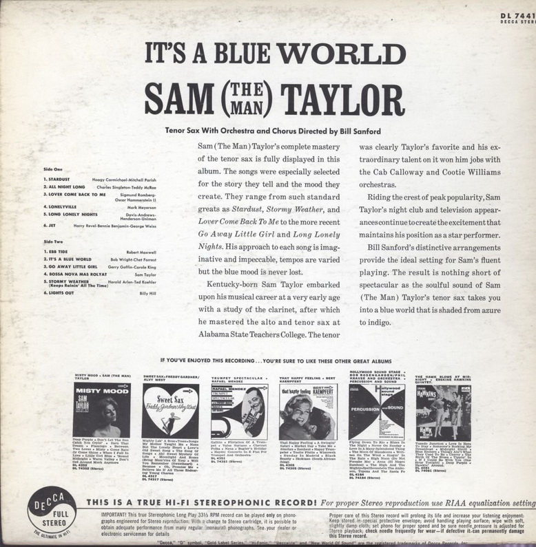 Der Tenor-Saxophonist Sam (The Man) Taylor wurde am 12. Juli 1916 in Lexington, Tennessee, als Samuel Leroy Taylor, Jr. geboren und verstarb am 5. Oktober 1990 im Crawford Long Hospital, Atlanta, Georgia. Neben seinen eigenen Veröffentlichungen war Taylor auch ungenannt als Session-Saxophonist bei sehr vielen bekannten Aufnahmen, wie beispielsweise bei Joe Turner's "Shake, Rattle And Roll" oder "Money Honey" von Clyde McPatter & The Drifters, dabei.