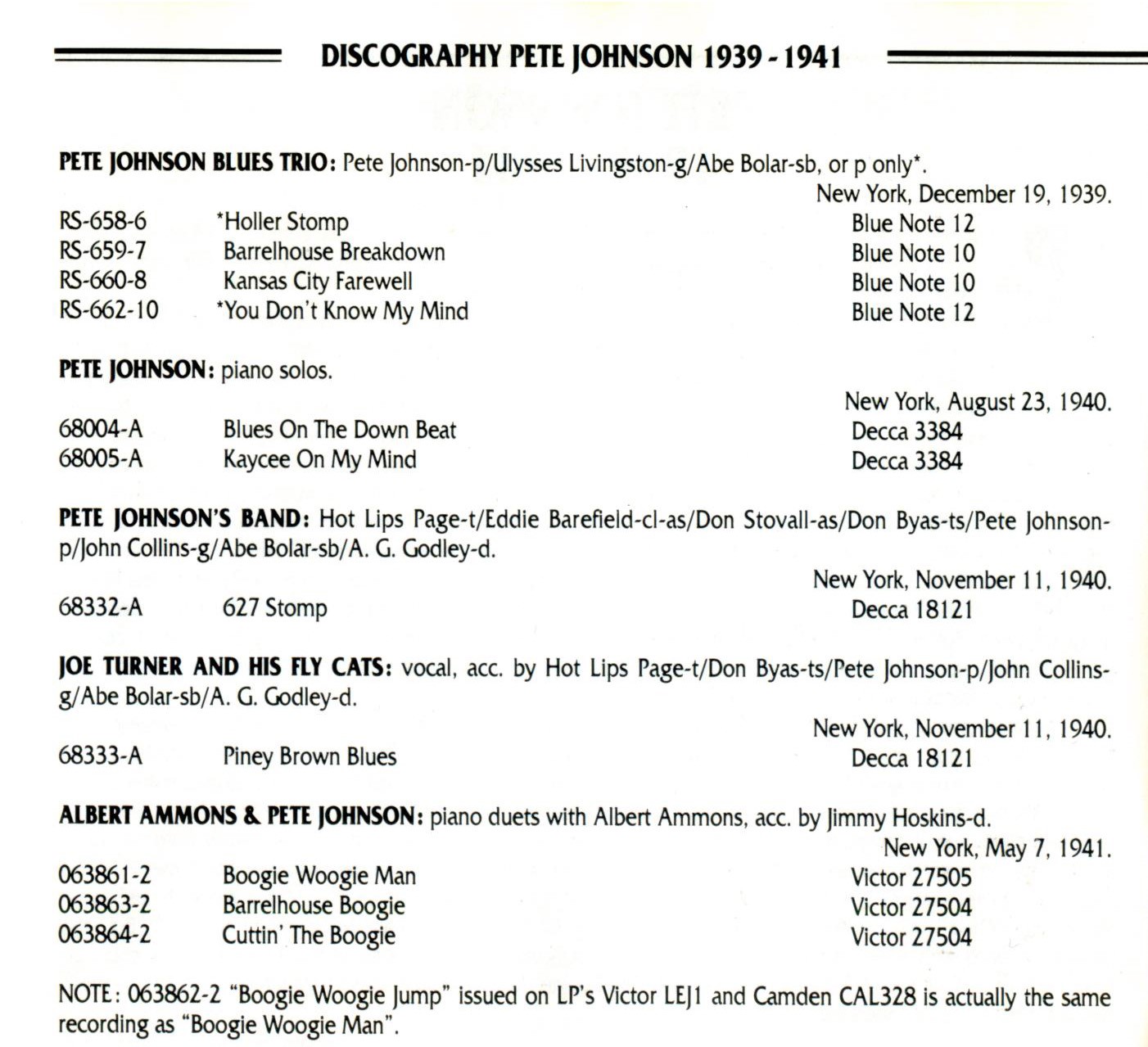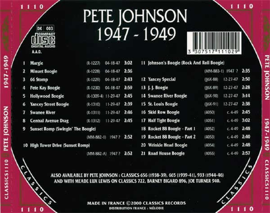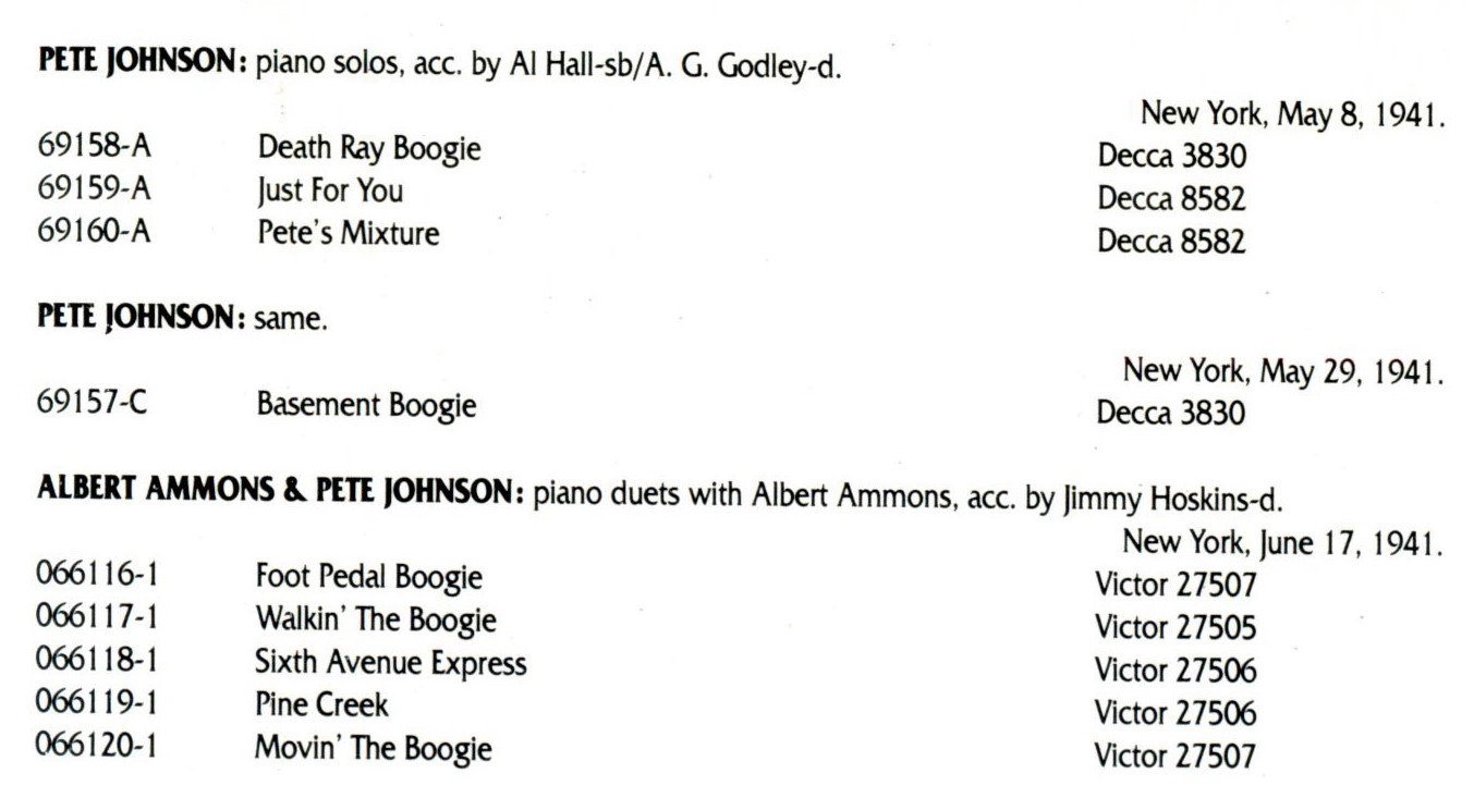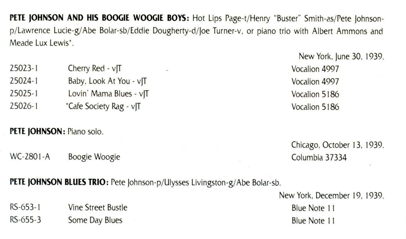 Pete Johnson (* Kermit H. Johnson, 25. März 1904, + 23. März 1967) war ein US-amerikanischer Boogie-Woogie- und Jazz-Pianist. Tony Russell erklärte in seinem Buch “The Blues – From Robert Johnson to Robert Cray“, dass „Johnson mit den anderen Mitgliedern des Boogie Woogie Trio die technische Virtuosität und melodische Fruchtbarkeit teilte, die diesen Stil zum aufregendsten aller Klaviermusikstile machen können, aber in einer Band fühlte er sich wohler als Meade Lux Lewis; und als Begleiter konnte er im Gegensatz zu Lewis oder Albert Ammons glänzen, seinen Gesangspartner aber nicht in den Schatten stellen.“ Scott Yanow für AllMusic schrieb: „Johnson war einer der drei großen Boogie-Woogie-Pianisten“, die anderen waren Lewis und Ammons, „deren plötzliche Bekanntheit in den späten 1930er Jahren dazu beitrug, den Stil sehr populär zu machen.“