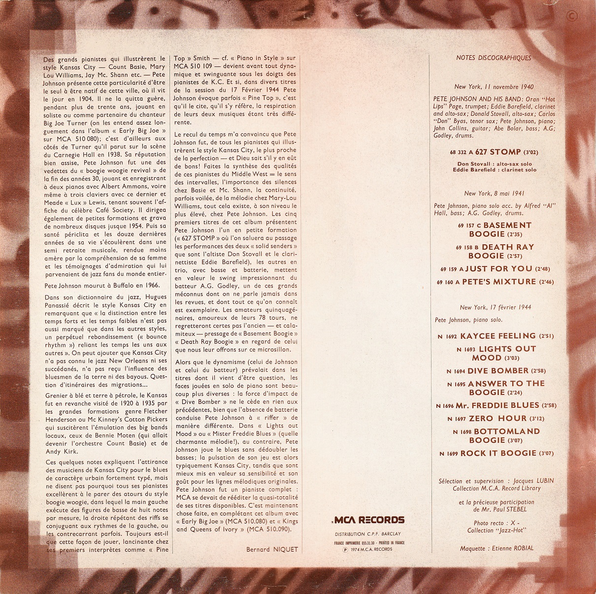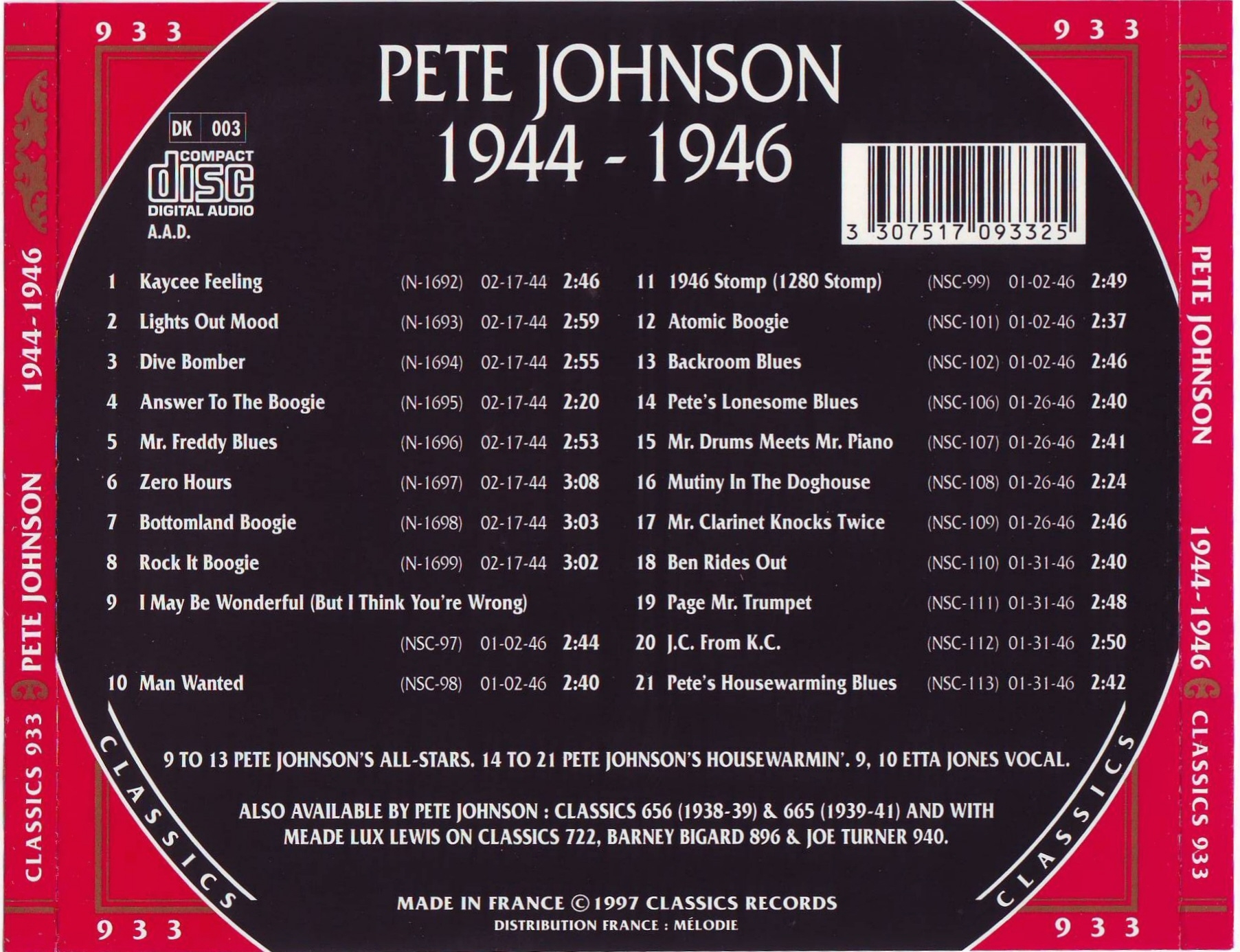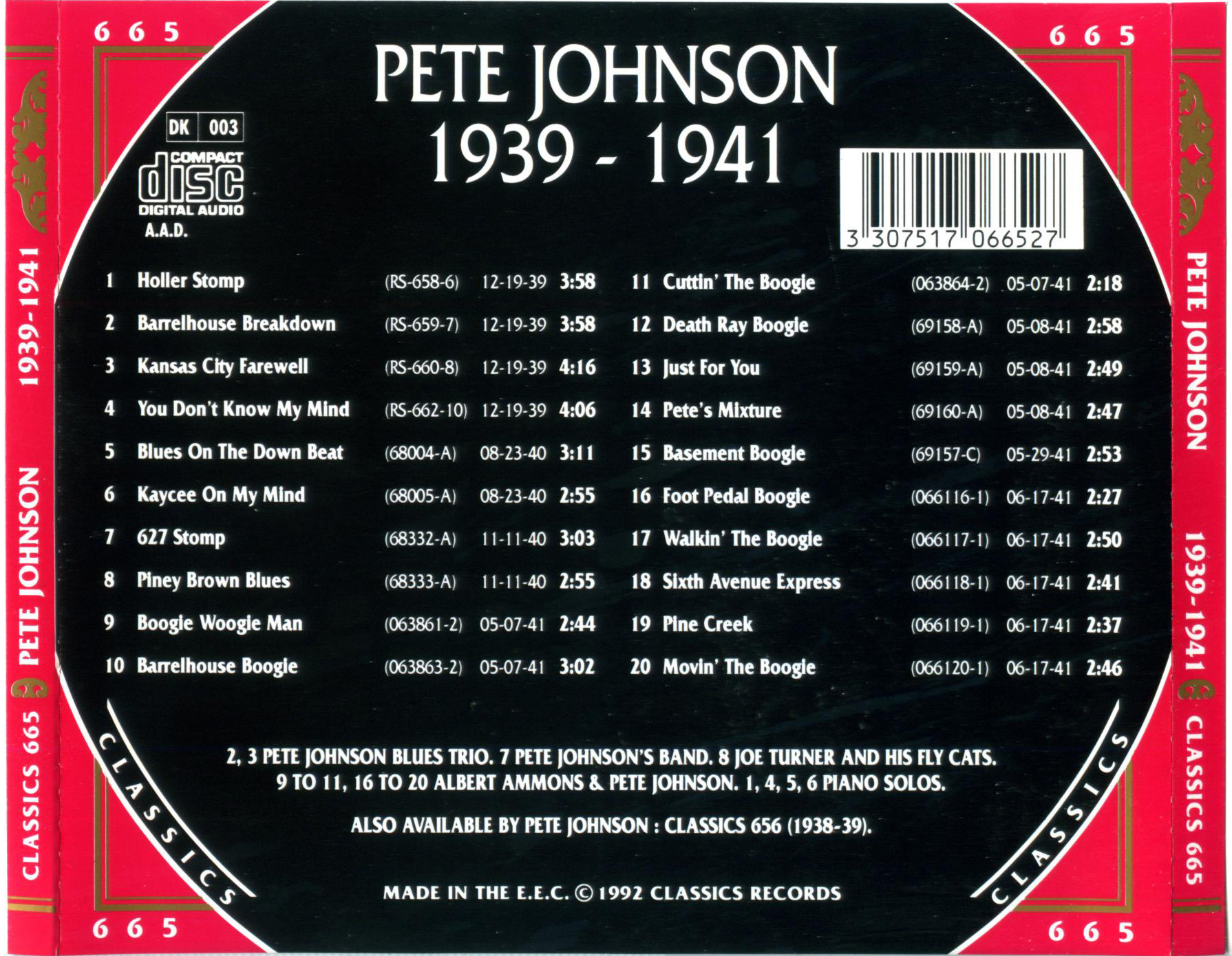 Pete Johnson (* Kermit H. Johnson, 25. März 1904, + 23. März 1967) war ein US-amerikanischer Boogie-Woogie- und Jazz-Pianist. Tony Russell erklärte in seinem Buch “The Blues – From Robert Johnson to Robert Cray“, dass „Johnson mit den anderen Mitgliedern des Boogie Woogie Trio die technische Virtuosität und melodische Fruchtbarkeit teilte, die diesen Stil zum aufregendsten aller Klaviermusikstile machen können, aber in einer Band fühlte er sich wohler als Meade Lux Lewis; und als Begleiter konnte er im Gegensatz zu Lewis oder Albert Ammons glänzen, seinen Gesangspartner aber nicht in den Schatten stellen.“ Scott Yanow für AllMusic schrieb: „Johnson war einer der drei großen Boogie-Woogie-Pianisten“, die anderen waren Lewis und Ammons, „deren plötzliche Bekanntheit in den späten 1930er Jahren dazu beitrug, den Stil sehr populär zu machen.“