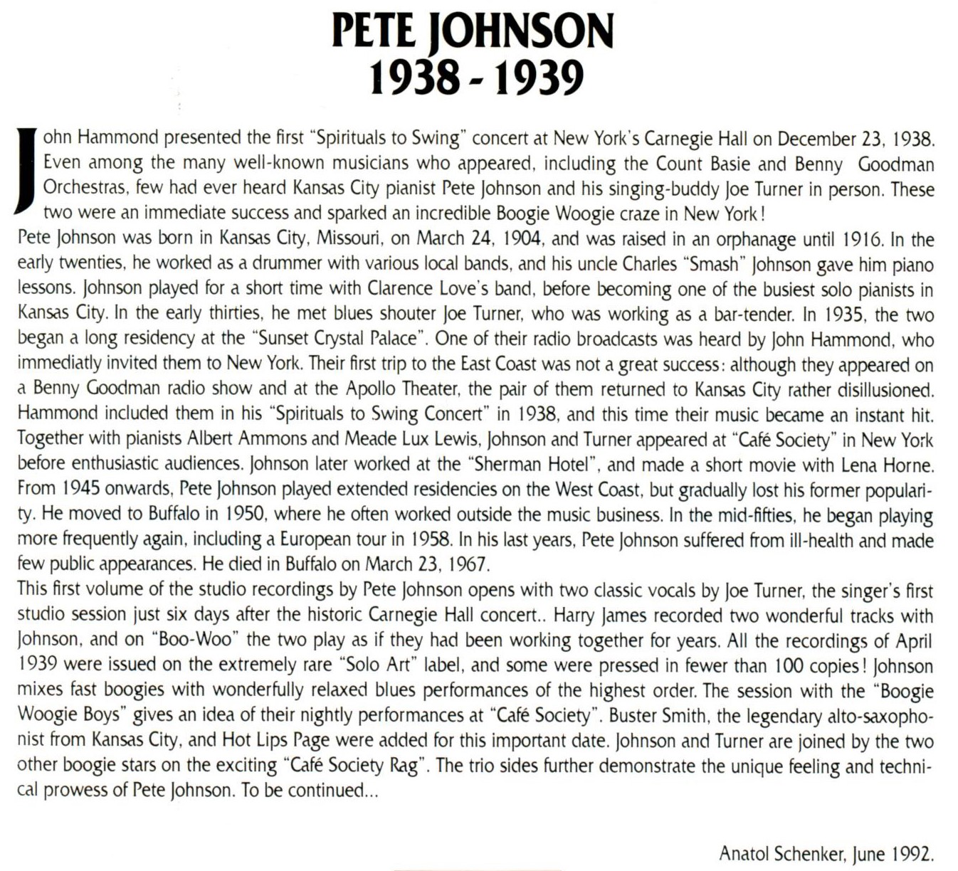 Pete Johnson starb zwei Monate später im Meyer Hospital in Buffalo/New York im März 1967, zwei Tage vor seinem 63. Geburtstag.