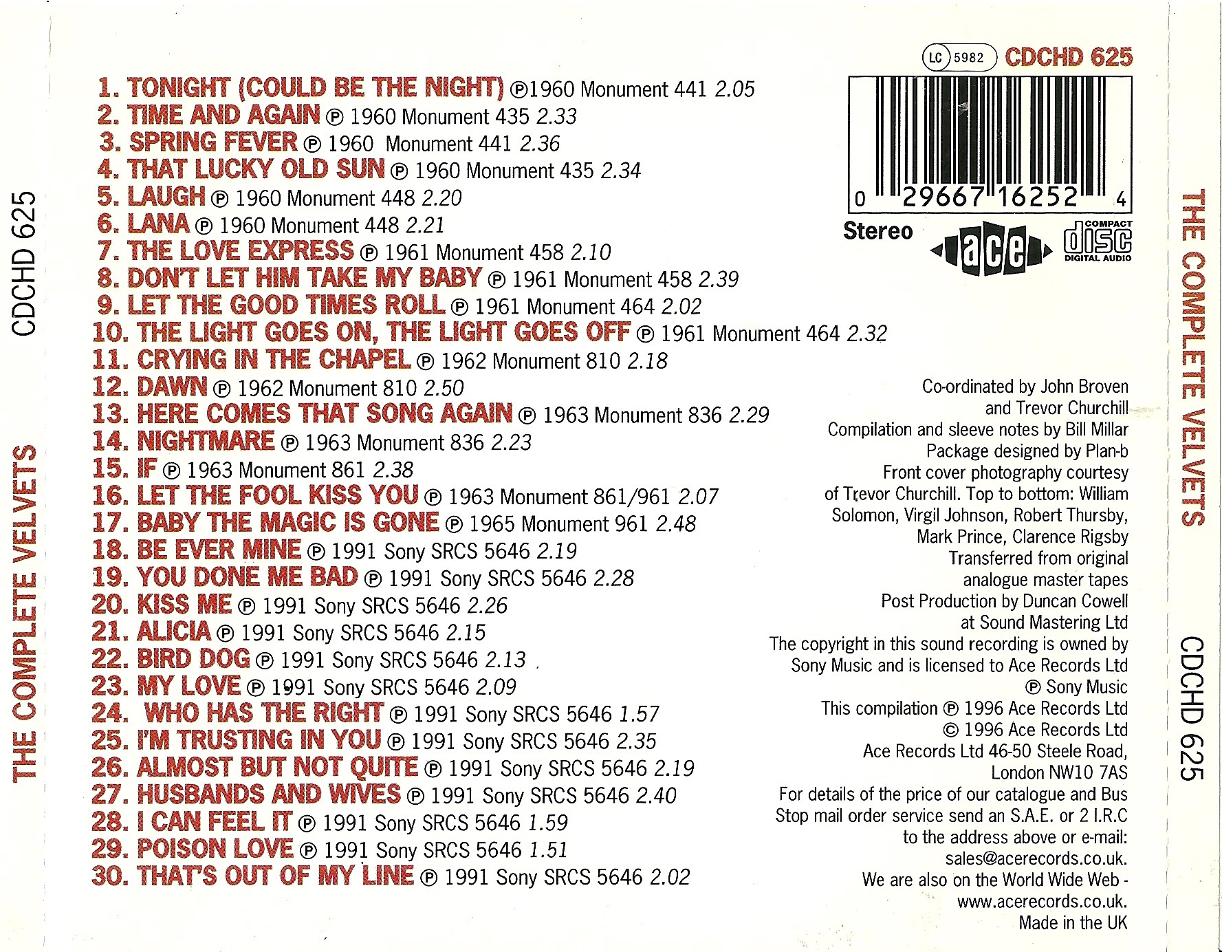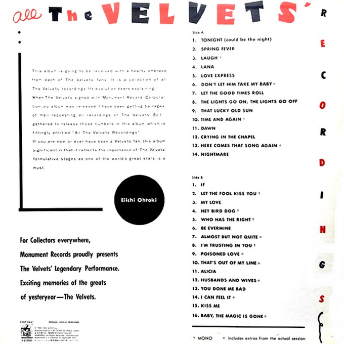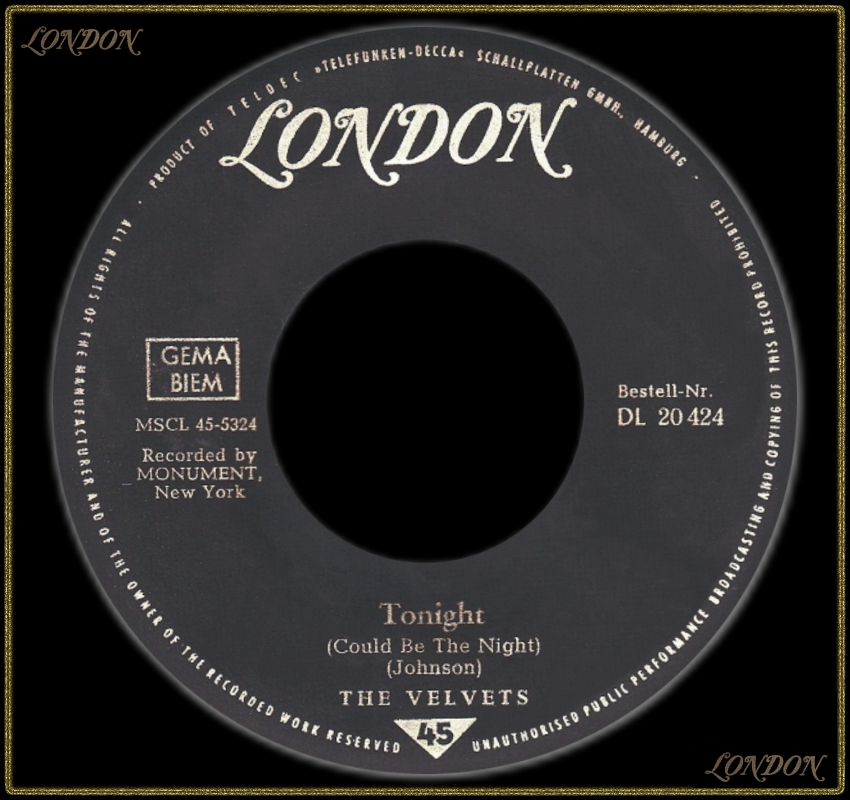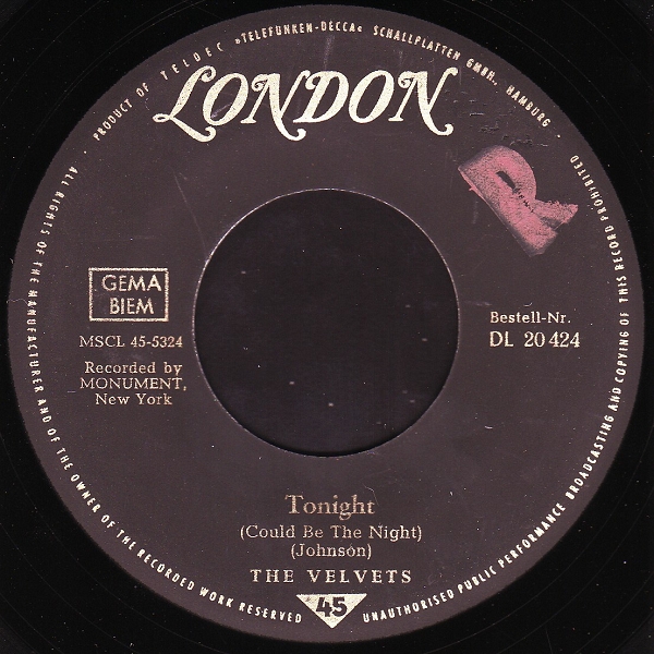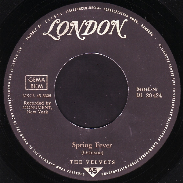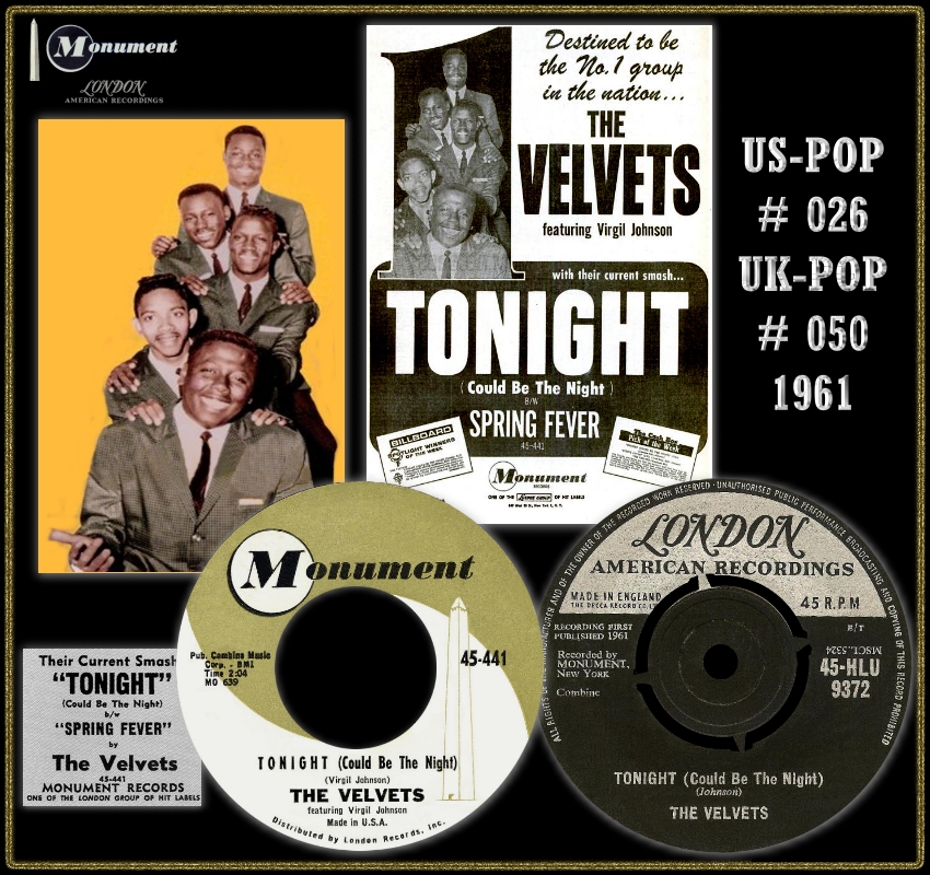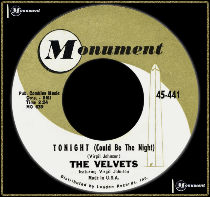 Die Velvets, eine afroamerikanische Doo-Wop Gruppe aus Odessa, Ector County, West-Texas, wurde 1959 von dem Hochschullehrer Virgil Johnson als Lead-Sänger, zusammen mit seinen Studenten Will Solomon, Bariton, Mark Prince, Bass, Clarence Rigsby, Lead-Tenor und Bob Thursby, Tenor, gegründet. Roy Orbison hörte dieses Quintett, fand Gefallen an ihnen und holte sie 1960 zu MONUMENT, wo sie bis zu ihrer Auflösung, etwa um 1966, verblieben. Johnson tritt gelegentlich heute noch bei Nostalgie-Konzerten auf.