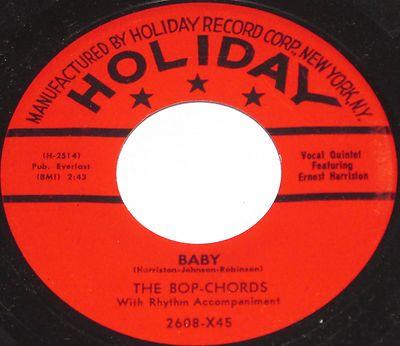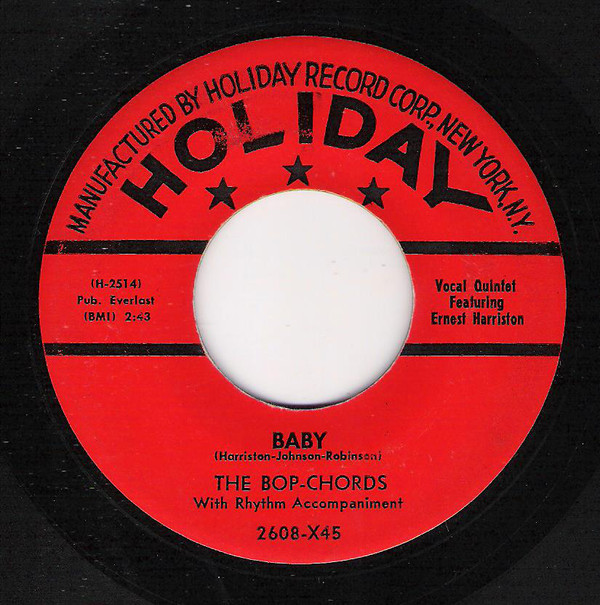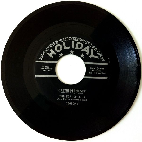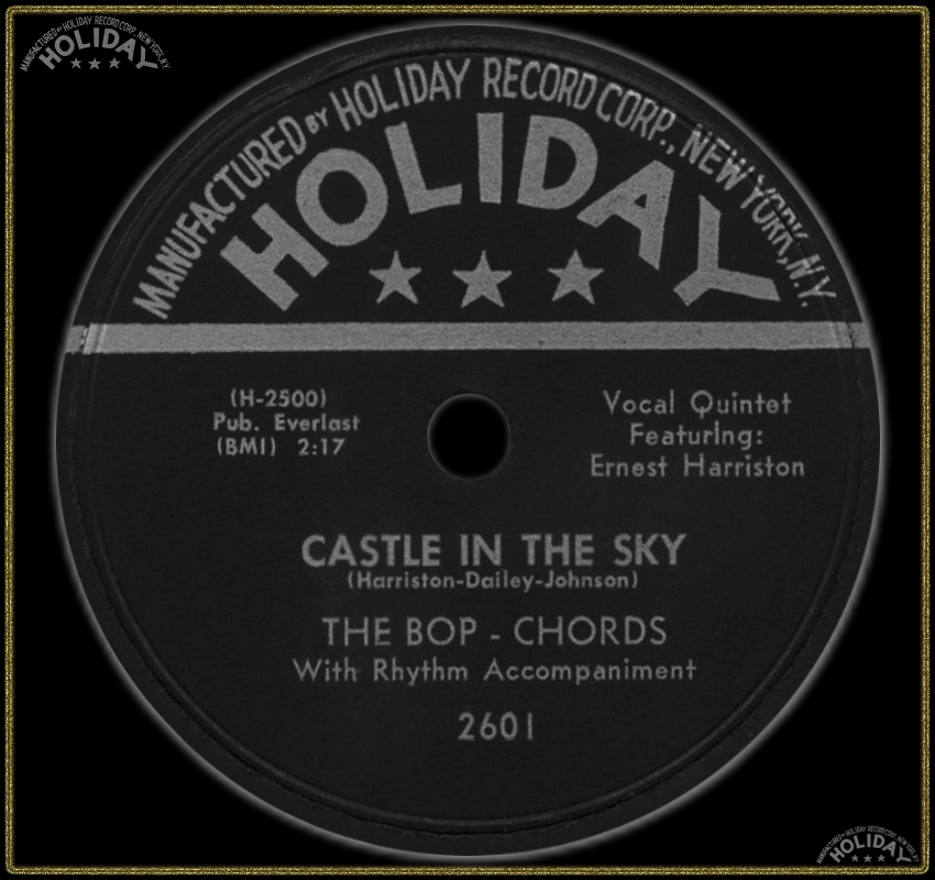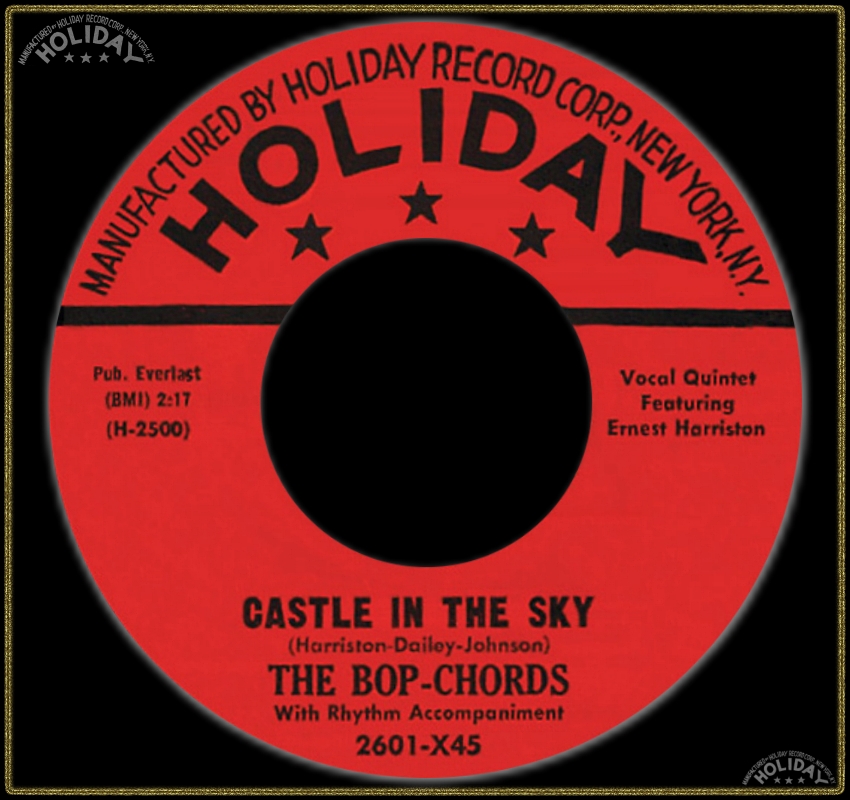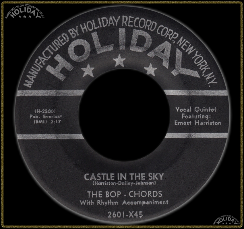 "Harlem's Bop Chords formed in 1955 in the same building where the Ladders, Channels and Willows got their start. Lead vocalist Ernest Harrison, William Dailey, Ken Hamilton, Leon Ivey, and Morris Smarr had all sung with other neighborhood groups, and Hamilton had recorded with the Five Wings earlier in the year on a tribute to Johnny Ace that was issued by King. The Bop Chords recorded for Holiday in 1956, and the midtempo "Castle In The Sky" was a local and regional hit. Their second single, "When I Woke Up This Morning," also did well on the East Coast, but internal clashes over song content and wardrobe soon caused lineup defections and changes. Dailey and Smarr left and were replaced by Skip Boyd and Peggy Jones, their first female vocalist. They recorded "Why" in 1957, then disbanded. Harrison did background vocals for Shep and the Limelites and recorded "We Need Love" for Asnes in 1962 as Ernie Johnson. A new edition of the Bop Chords resurfaced in 1971, with lead vocalist Johnson, Hamilton, Boyd and Ivey. They never recorded, but were a popular attraction at various New York locations and oldies shows in the '70's"