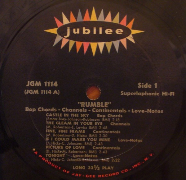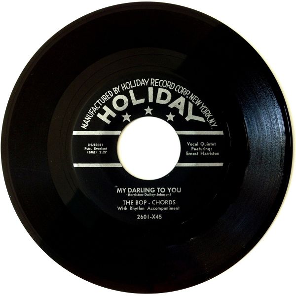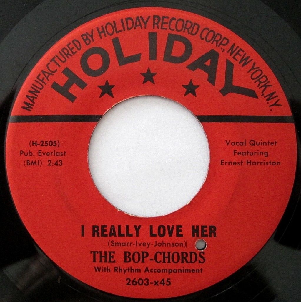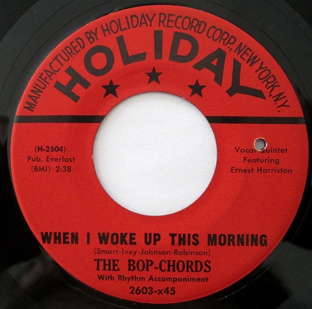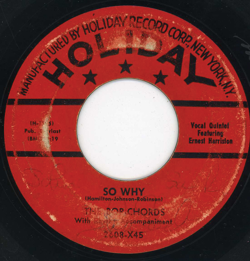 "Harlem's Bop Chords formed in 1955 in the same building where the Ladders, Channels and Willows got their start. Lead vocalist Ernest Harrison, William Dailey, Ken Hamilton, Leon Ivey, and Morris Smarr had all sung with other neighborhood groups, and Hamilton had recorded with the Five Wings earlier in the year on a tribute to Johnny Ace that was issued by King. The Bop Chords recorded for Holiday in 1956, and the midtempo "Castle In The Sky" was a local and regional hit. Their second single, "When I Woke Up This Morning," also did well on the East Coast, but internal clashes over song content and wardrobe soon caused lineup defections and changes. Dailey and Smarr left and were replaced by Skip Boyd and Peggy Jones, their first female vocalist. They recorded "Why" in 1957, then disbanded. Harrison did background vocals for Shep and the Limelites and recorded "We Need Love" for Asnes in 1962 as Ernie Johnson. A new edition of the Bop Chords resurfaced in 1971, with lead vocalist Johnson, Hamilton, Boyd and Ivey. They never recorded, but were a popular attraction at various New York locations and oldies shows in the '70's"