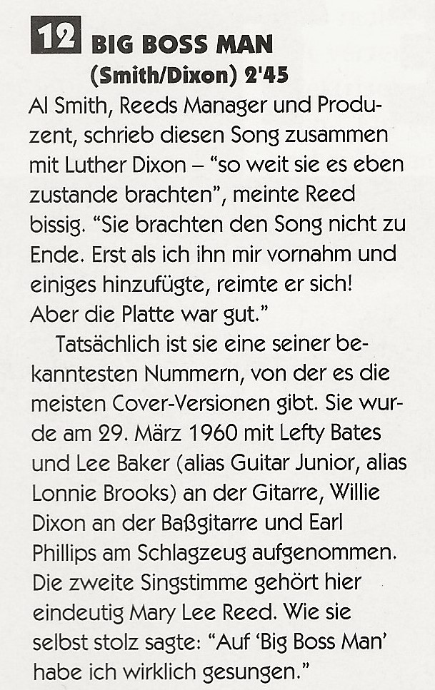 Big Boss Man ist ein Bluessong der 1960 von Jimmy Reed aufgenommen wurde, von dem Haussongschreiber von Vee-Jay Al Smith und Luther Dixon seinem Produzenten, für Jimmy Reed geschrieben wurde. 1961 erschien der Song von Jimmy Reed als Single auf (Vee Jay VJ 380).