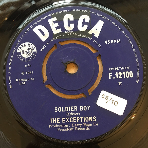 1965 wurde ihnen dann endlich ein Imagewechsel gestattet und die Gruppe wurde als Exceptions neu aufgelegt. Die Schulklamotten waren endlich weg und sie sahen aus wie die vollwertigen Mods, die sie immer sein wollten – Georgie legte sogar ihre Brille ab – und nahmen einen Ivy-League-Song auf, Carter-Lewis' wunderbar bluesig angehauchtes “What More Do You Want“. Doch eine Zeitung berichtete, dass sie von dieser Wahl nicht gerade begeistert waren: „The Orchids – äh, Entschuldigung, Exceptions – ziehen zwei andere Nummern vor, eine, die sie selbst geschrieben haben, und die andere eine alte Nummer von Miracles.“ Tatsächlich lag das wahre Juwel dieser Veröffentlichung auf der Rückseite und es war die „Nummer, die sie selbst geschrieben haben“ – ‘Soldier Boy“. Dies war eine gelungene, gefühlvolle Ballade einer Mädchengruppe, die von Georgina geschrieben wurde und so amerikanisch klang, dass viele Sammler jahrelang davon ausgingen, der Titel sei von einer schwarzen Mädchengruppe aus den USA – sicherlich eine der besten britischen Platten ihrer Art und wahrscheinlich viel kommerzieller als die offizielle A-Seite. „Als wir einmal aus irgendeinem Grund in London waren, erwähnten wir Larry gegenüber zufällig, dass ich ein Lied geschrieben hatte“, erinnert sich Georgina. „Er ließ uns es für ihn singen. Wir standen im Kassner-Büro, umgeben von Führungskräften, und sangen ihnen das Lied a cappella vor. Ich kann mich erinnern, wie ich sehr nervös und schüchtern vor diesem großen Holzschreibtisch stand. Unnötig zu sagen, dass es ihnen wohl gefiel. Ich erinnere mich nicht an den Zeitrahmen von damals bis zur Aufnahme, und nein, ich hatte kein Mitspracherecht beim Arrangement oder der Produktion und hätte sowieso keine Ahnung gehabt.“