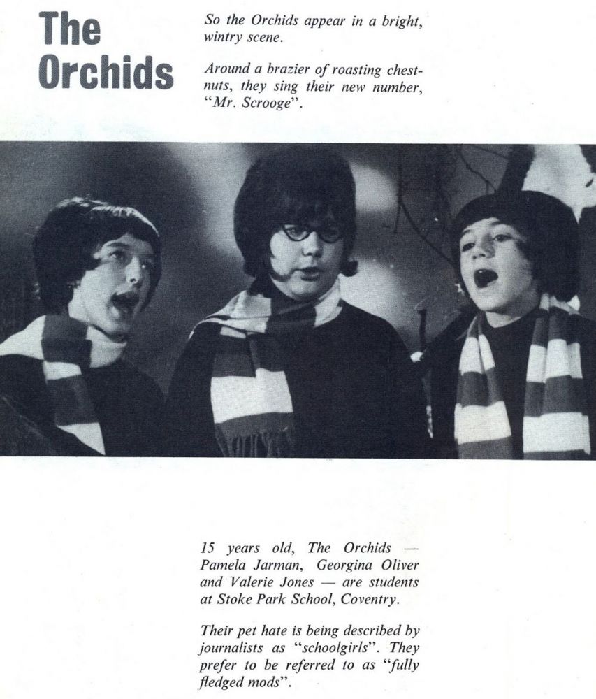 Die Orchids, Schulmädchen aus Coventry, deren Sound stark an die amerikanischen Crystals erinnerte. Während die Sängerinnen und Girlgroups der britischen Plattenszene der 1960 er Jahre typischerweise in ihren Zwanzigern waren, waren die Orchids aus Coventry - Georgina Oliver, Pamela Jarman und Valerie Jones - 14-jährige Schulmädchen, als sie ihre erste Platte aufnahmen. Damit sind sie Anwärterinnen auf den Titel der einzigen echten Girlgroup Großbritanniens.