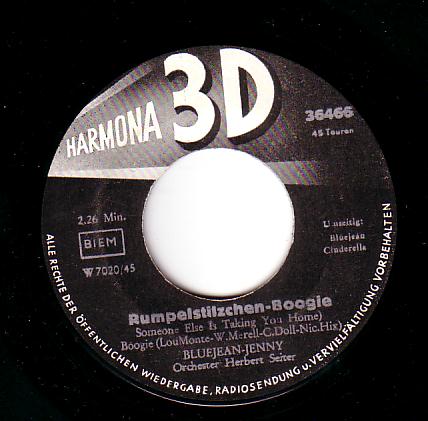 Die Rückseite von Lou Monte's "Calypso Italiano", "Someone Else Is Taking You Home" in deutscher Version, interpretiert von Bluejean-Jenny mit dem kuriosen Titel "Rumpelstilzchen-Boogie" auf HARMONA 3D. Rückseite: Bluejean Cinderella. Auch eine Cover-Version geschrieben von J. Dixon und N. Kinsey. Ich hab aber die Original-Version noch nicht eruieren können.