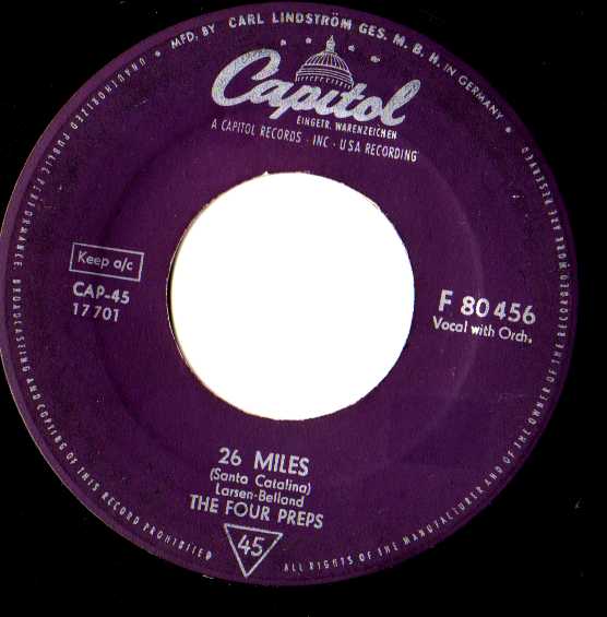 26 Miles wurde auch in deutschen Coverversionen veröffentlicht. Mir liegt der Titel vom Hansen-Quartett auf Columbia 20943 und von den Ohayos auf Polydor 23777 vor. Auf deutsch hies es korrekt übersetzt 26 Meilen.