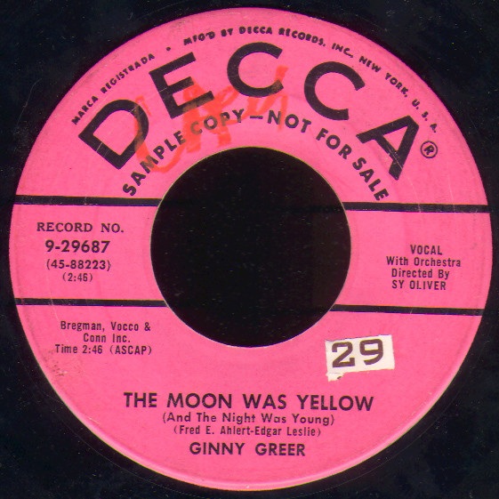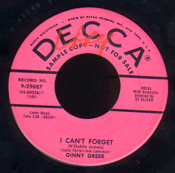 12 55....9-29687....GINNY GREER..I Can't Forget (N'oublie Jamais) (45-88226)/The Moon Was Yellow (And The Night Was Young) (45-88223)