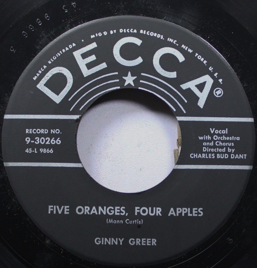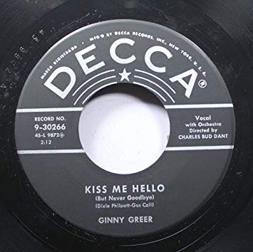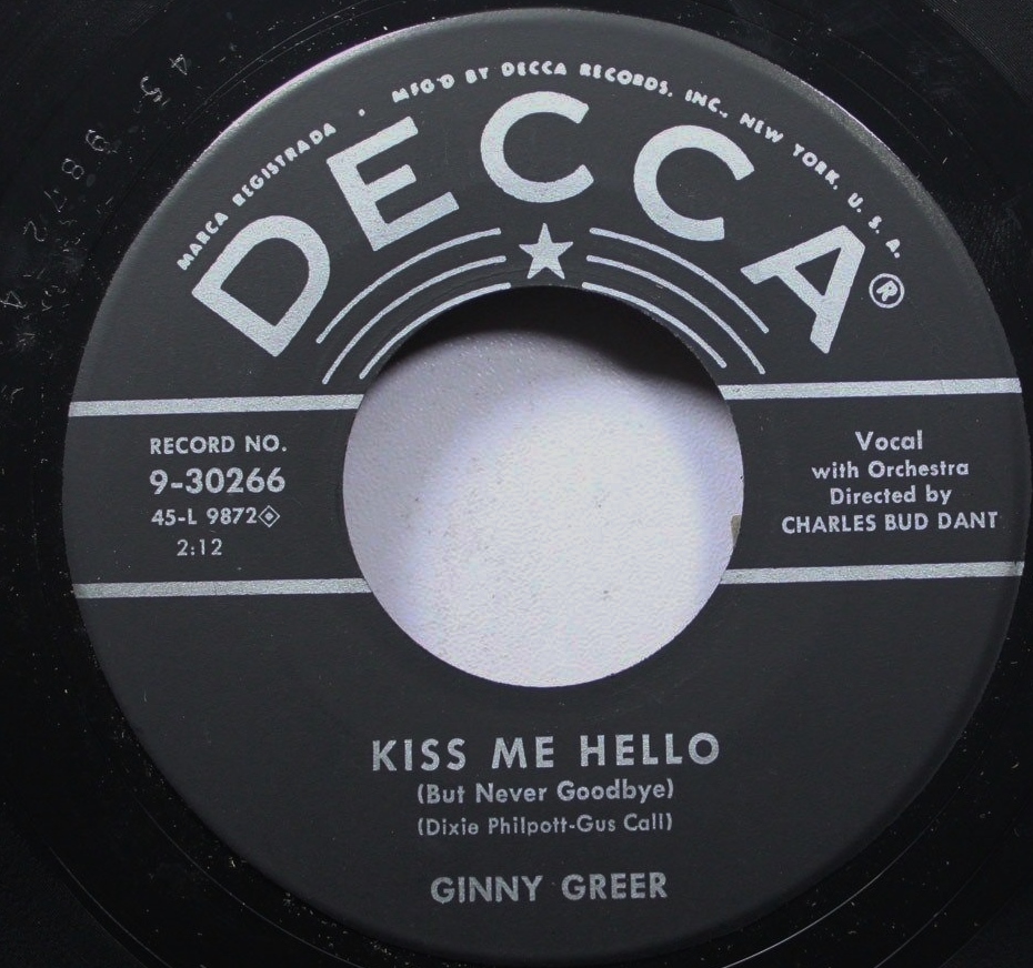 04 57....9-30266....GINNY GREER..Kiss Me Hello (But Never Goodbye) (45-L 9872)/Five Oranges, Four Apples (45-L 9866)