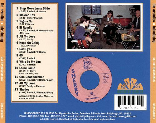 "69" is still a local cult hit, and was resurrected in the '80s by the Cynics, whose Gregg Kostelich in 1999 released the first Arondies CD on the Get Hip label, "Introducing the Arondies." The 13 tracks were laid in live sessions dating from November 1964 to a radio appearance on WMCK from 1965.